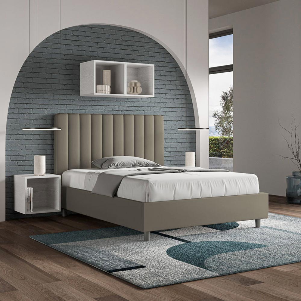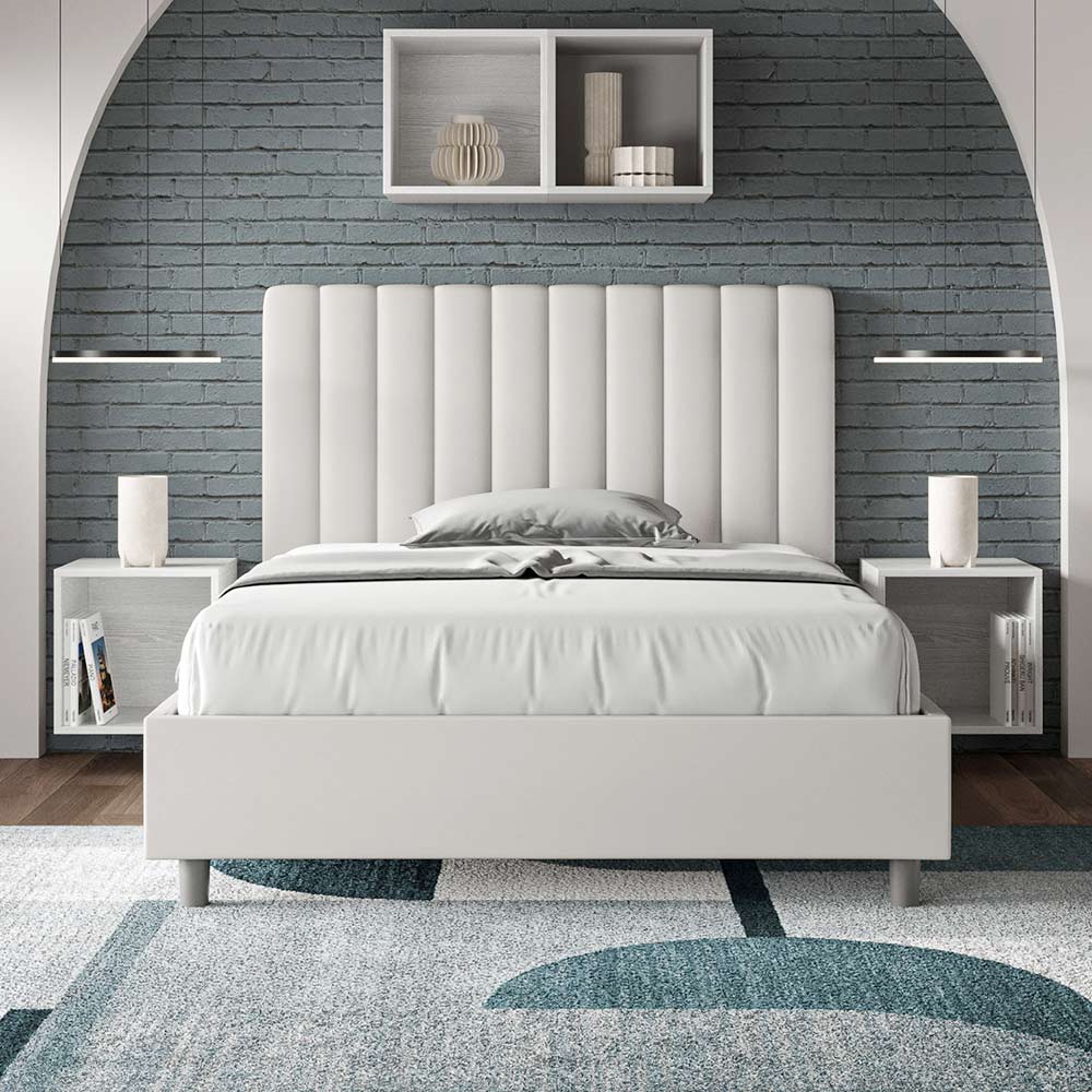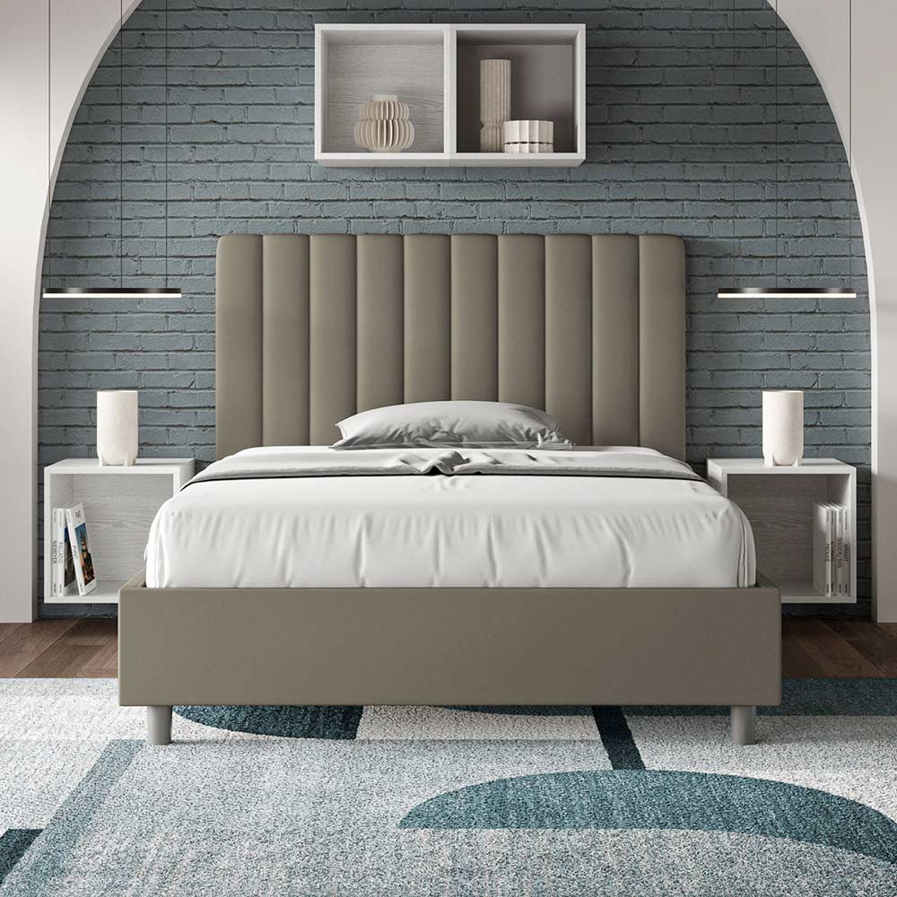 Gepolstertes Queensize-Bett (120 x 200 cm) aus Spanplatten , bezogen mit Kunstleder , vollständig in Italien hergestellt. Dieses Queensize-Bett mit gepolstertem Bettgestell ist ideal für alle, die ein stilvolles Möbelstück suchen, ohne dass es zu aufdringlich wirkt. Das minimalistische Kopfteil mit seiner dezenten Steppung aus symmetrischen, vertikalen Linien fügt sich harmonisch in jedes Ambiente ein, ob modern oder klassisch. Der Kunstlederbezug verleiht dem Raum eine warme, einladende Atmosphäre. Er eignet sich besonders für helle Räume, da das Material auch nach längerer Sonneneinstrahlung farbecht bleibt.