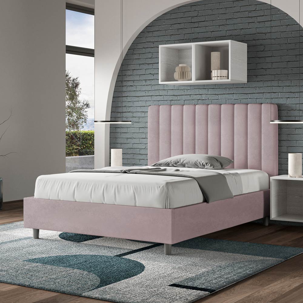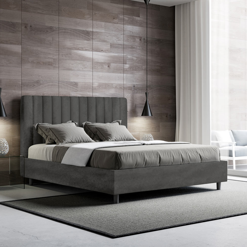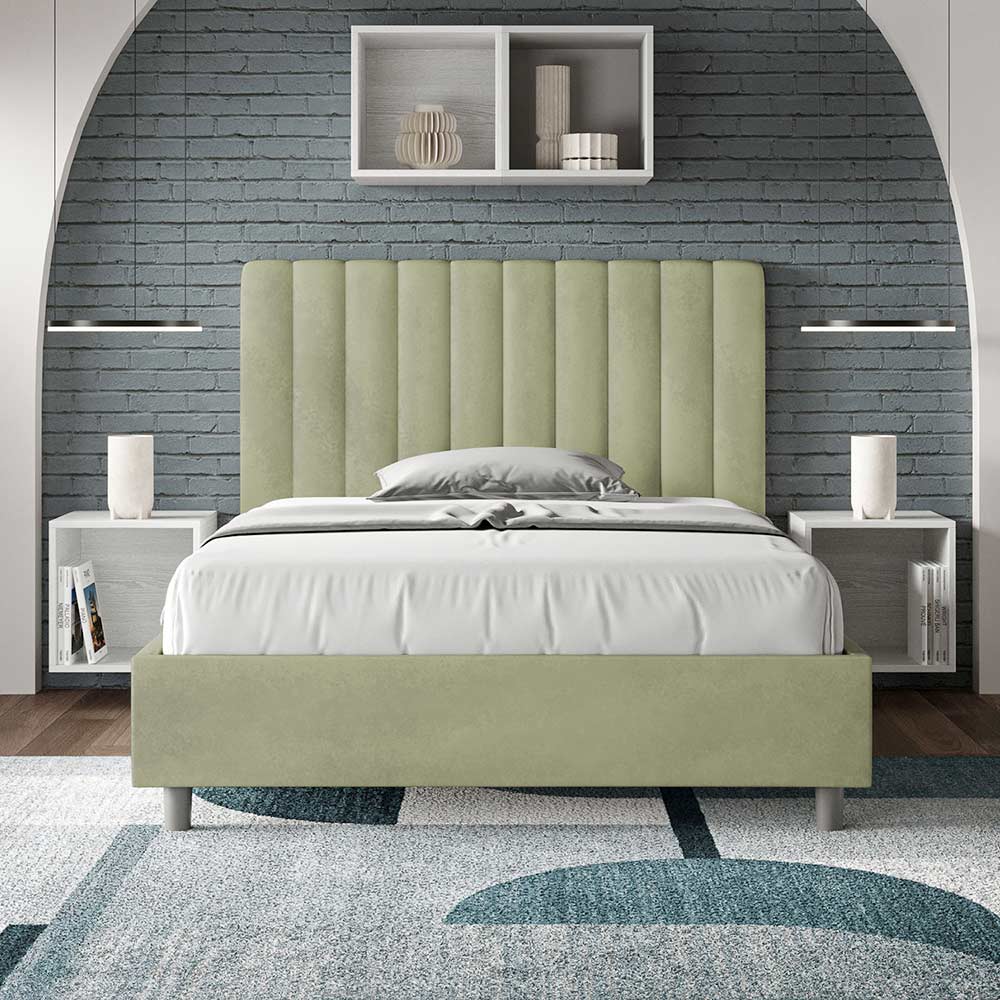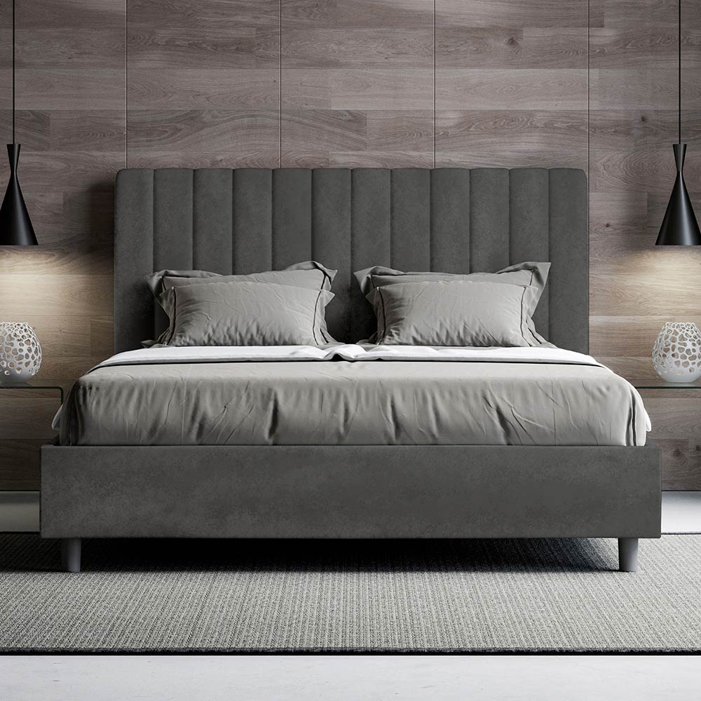 Französisches Bett 140x200 cm, gepolstert aus Melaminplatten und mit Mikrofaser bezogen, vollständig Made in Italy. Dieses französische Bett mit gepolstertem Bettrahmen ist ideal für alle, die ein ausdrucksstarkes Möbelstück suchen, ohne dass es zu aufdringlich wirkt. Das minimalistische Kopfteil mit seiner dezenten Steppung aus symmetrischen, vertikalen Linien fügt sich harmonisch in jedes Ambiente ein, ob modern oder klassisch.