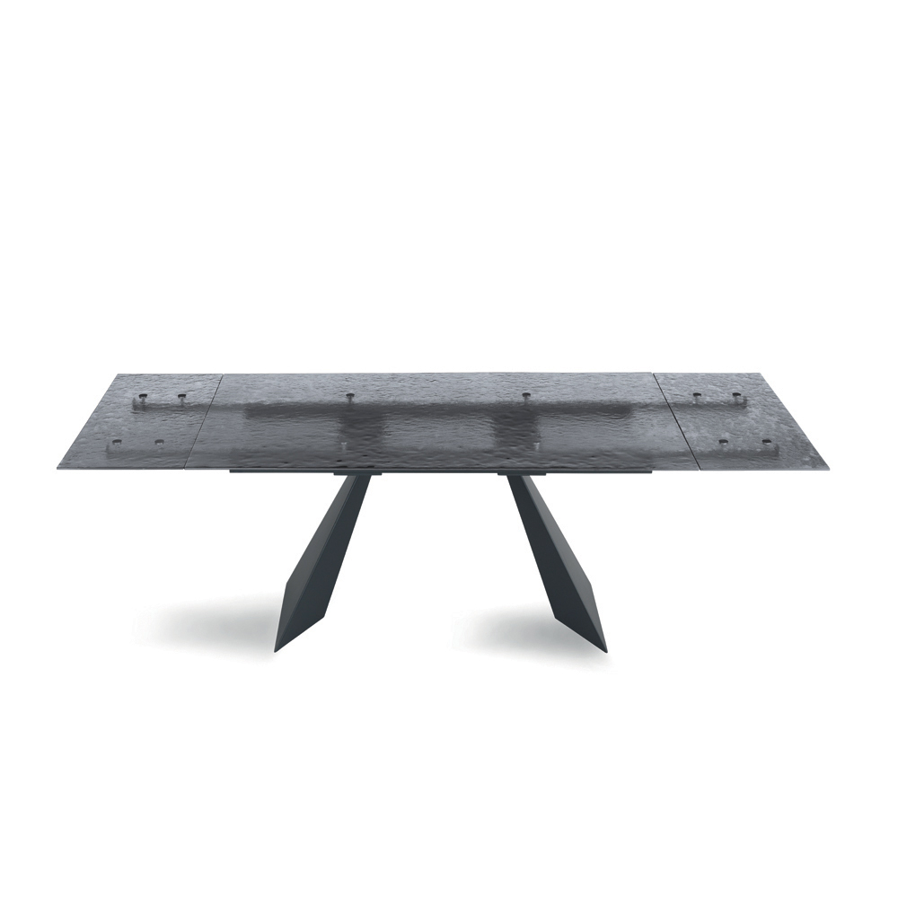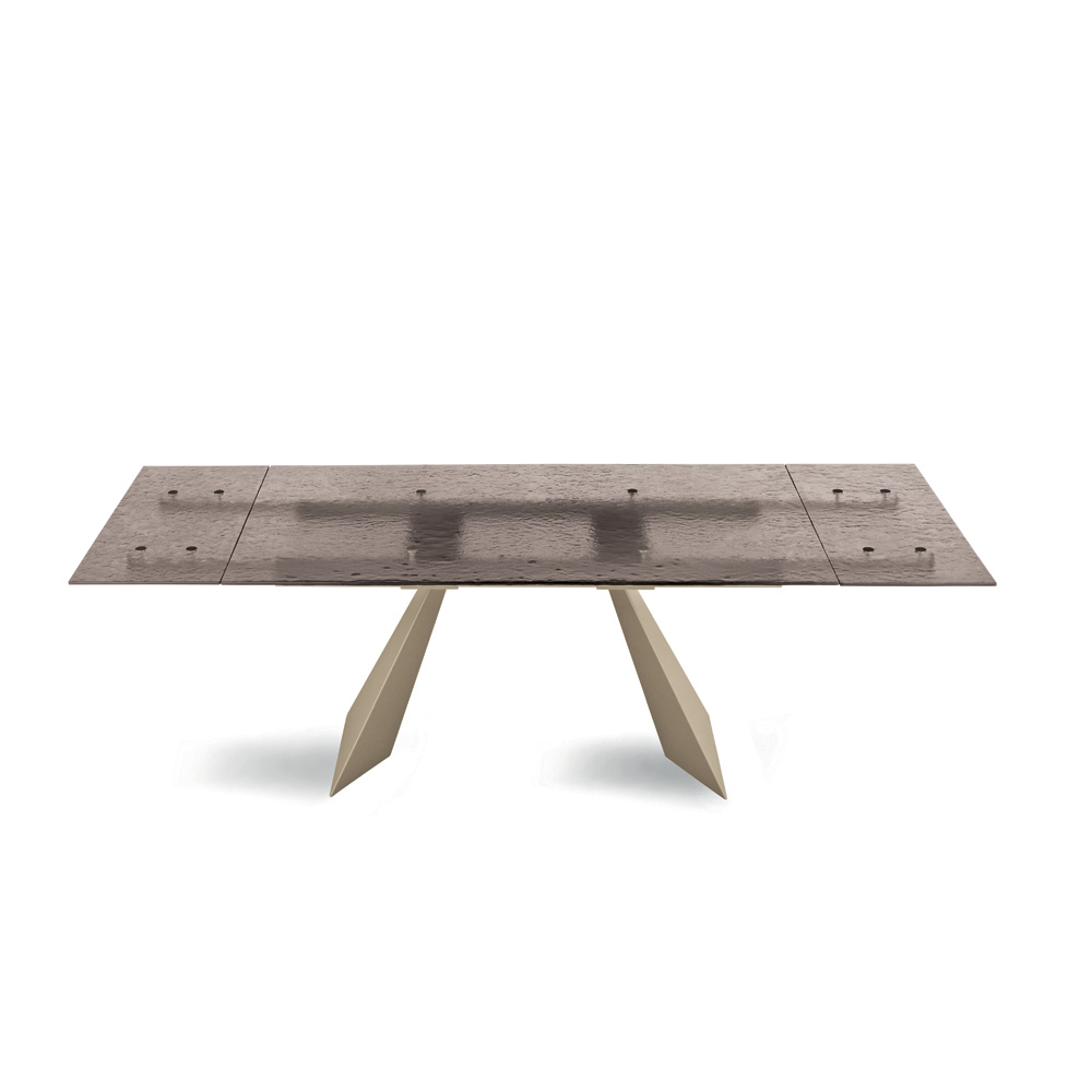 Dieser Esstisch verkörpert eine innovative Interpretation modernen Designs und vereint hochwertige Materialien mit einer skulpturalen Form, die sofort ins Auge fällt. Die Tischplatte aus gehämmertem Glas ist ein wahres Kunstwerk: Jedes Detail ihrer Oberfläche reflektiert das Licht auf einzigartige Weise und erzeugt so ein faszinierendes Spiel von Spiegelungen und Transparenzen, das dem Raum Tiefe und optische Reize verleiht.