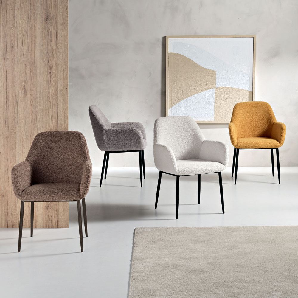 Der Stuhl verfügt über eine breite, bequeme Sitzfläche mit integrierten Armlehnen und besticht durch seine kompakte, geometrische Form, die für hohen Sitzkomfort im Alltag sorgt. Der Bouclé-Stoff unterstreicht die Weichheit der Sitzfläche und schafft so ein perfektes Gleichgewicht zwischen Ästhetik und Funktionalität.