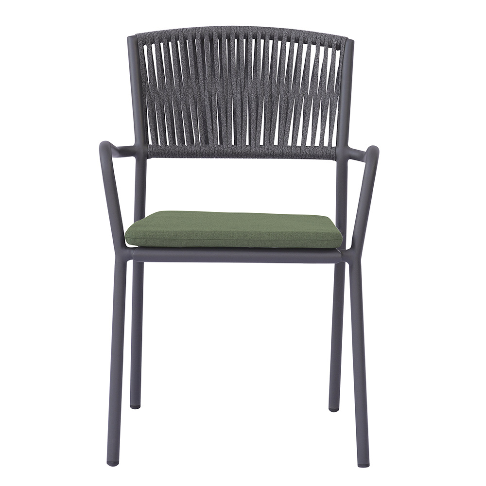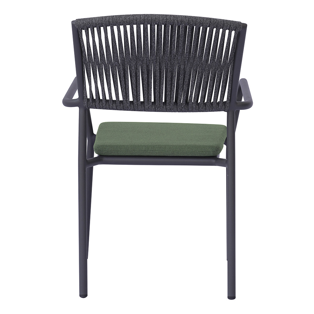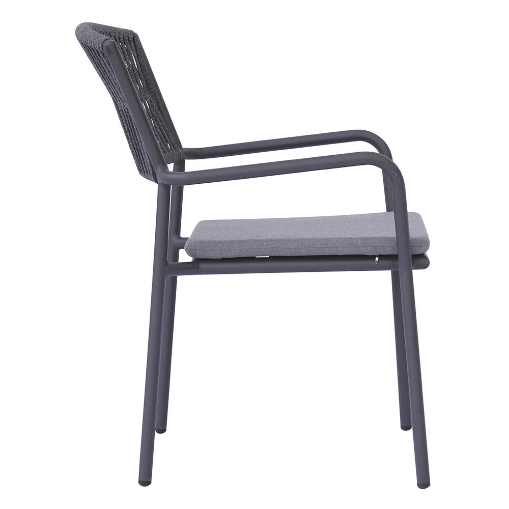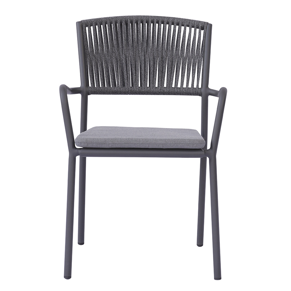Die Rückenlehne aus Outdoor-Seil verleiht dem Ganzen eine raffinierte, moderne Note und sorgt für Komfort und Atmungsaktivität, während der Aluminiumsitz mit passendem Kissen Weichheit und Bequemlichkeit bietet und jeden Moment der Entspannung noch angenehmer macht.