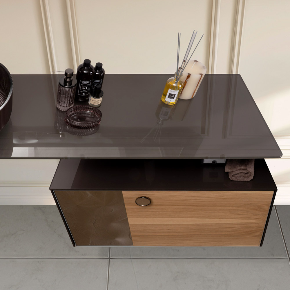 Der Mittelteil aus Naturholz mit sichtbarer Maserung verbindet sich harmonisch mit der Oberseite und den Seiten, die aus 8 mm extraklarem, gehärtetem Farbglas bestehen . Der seitliche Einsatz der Schublade besteht aus gebogenem Glas , das sich durch einen dreidimensionalen Effekt mit Lichtreflexen auszeichnet und das Design mit einem unverwechselbaren und raffinierten Detail bereichert.