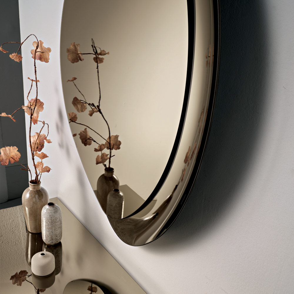 Das Design zeichnet sich durch einen markanten Halbrahmen aus Ton-in-Ton-Glas aus, der die Spiegelfläche teilweise einrahmt. Dieses Detail verleiht dem Spiegel Struktur und Leuchtkraft und erzeugt ein faszinierendes Spiel der Spiegelungen, das ihm Tiefe und Charakter verleiht.