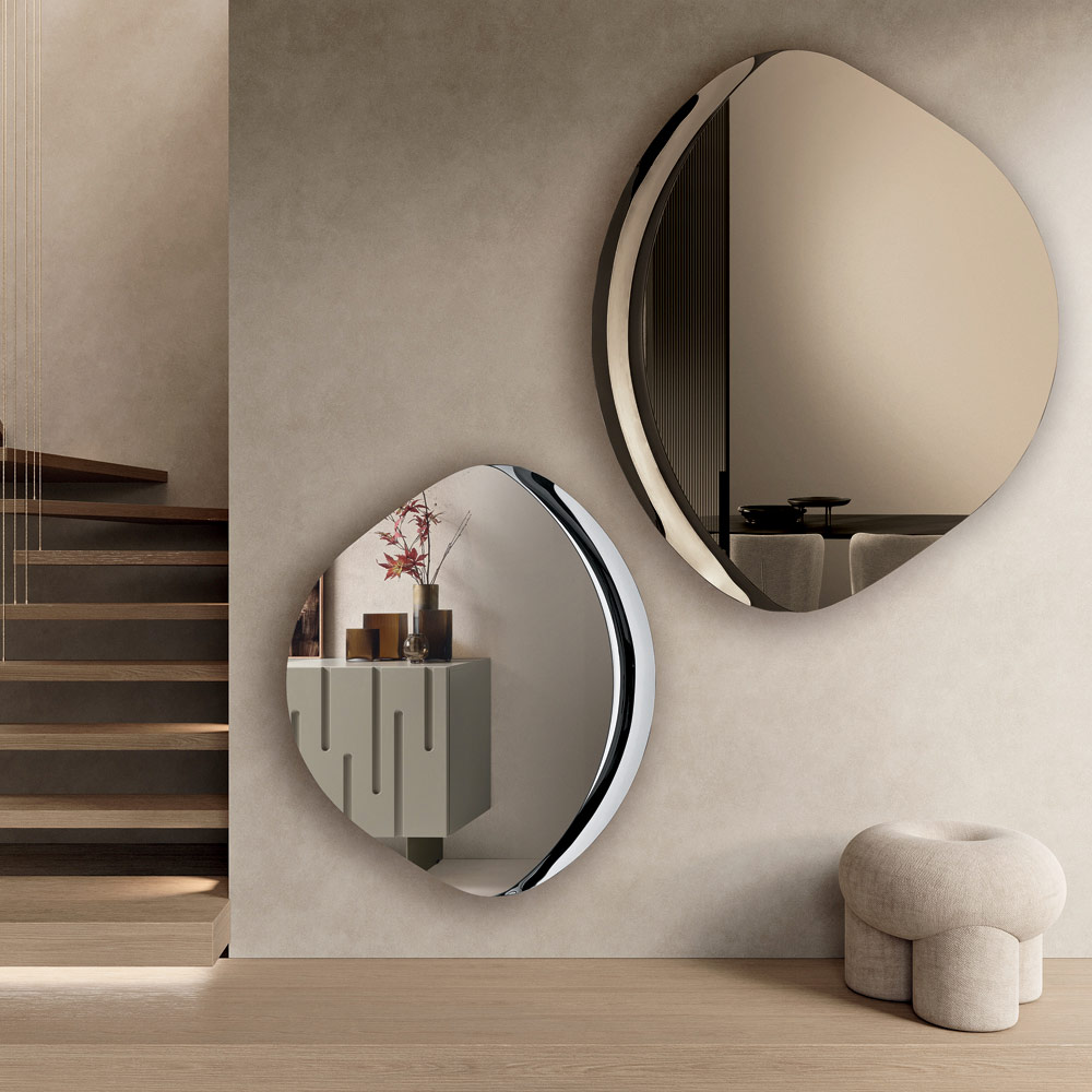 Ein eleganter , formschöner Spiegel, der verschiedene Räume im Haus – vom Eingangsbereich über das Wohnzimmer bis zum Schlafzimmer – stilvoll aufwertet. Seine geschwungene, moderne Form macht ihn zu einem echten Dekorationselement, das jedem Raum Persönlichkeit und Eleganz verleiht.