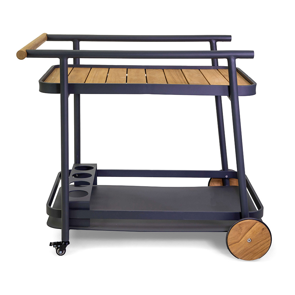 Wagen für den Außenbereich mit pulverbeschichteter Aluminiumstruktur, flache Platte aus 15mm Teakholzleisten, Teakholzgriff Durchmesser 35x70mm