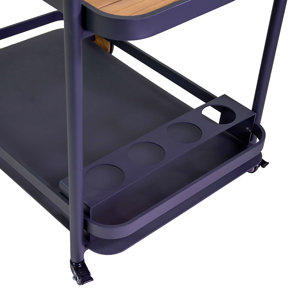 Die Eichenholzplatte fügt eine natürliche Wärme und überlegene Beständigkeit gegen die Elemente hinzu, was sie nicht nur schön, sondern auch langlebig macht. Ausgestattet mit einer geräumigen unteren Ablage bietet dieser Wagen reichlich Platz für die Aufbewahrung von Tellern, Gläsern und Servierzubehör, während der praktische integrierte Flaschenhalter dafür sorgt, dass Ihre Getränke immer in Reichweite sind.