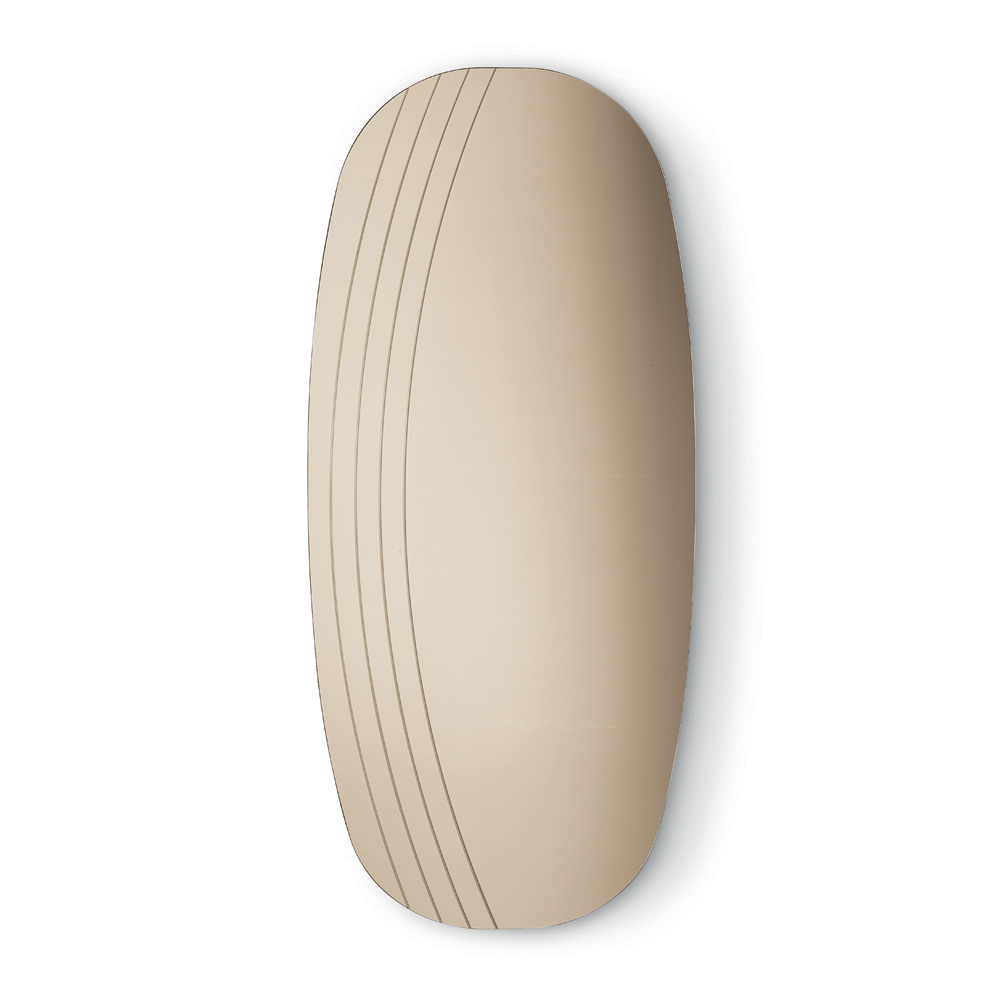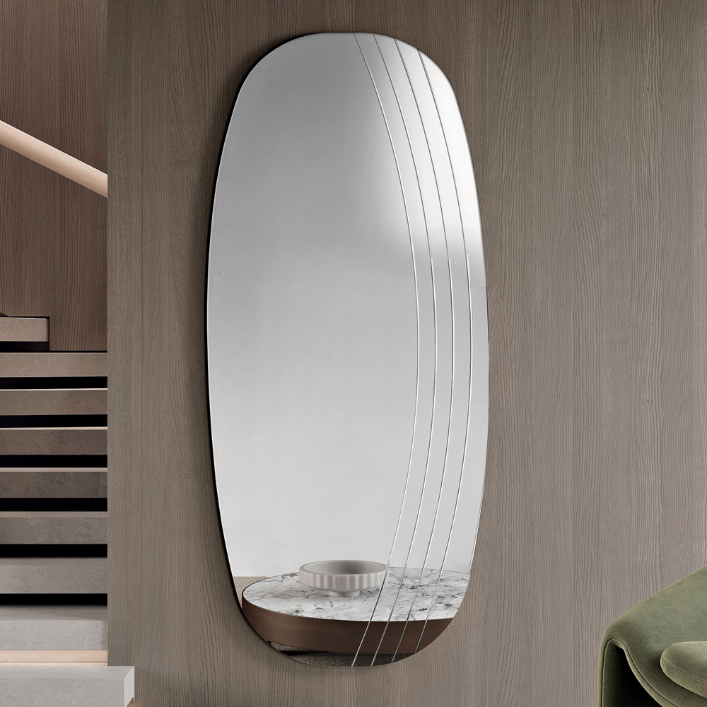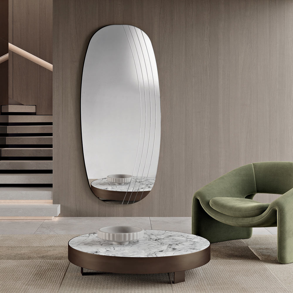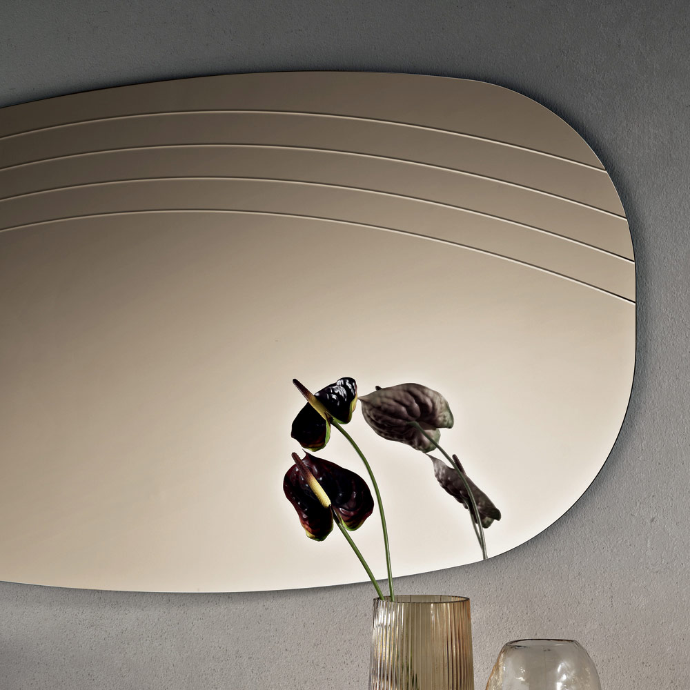 Die reflektierende Oberfläche wird durch feine seitliche Einschnitte veredelt, die der geschwungenen Form des Spiegels folgen und ein raffiniertes Spiel von Licht und Textur erzeugen. Dieses dekorative Detail verleiht dem Spiegel optische Tiefe und betont die Harmonie der Formen, wodurch er eine elegante und moderne Ausstrahlung erhält.