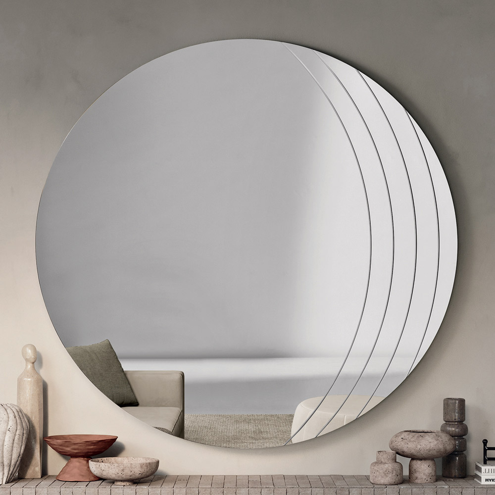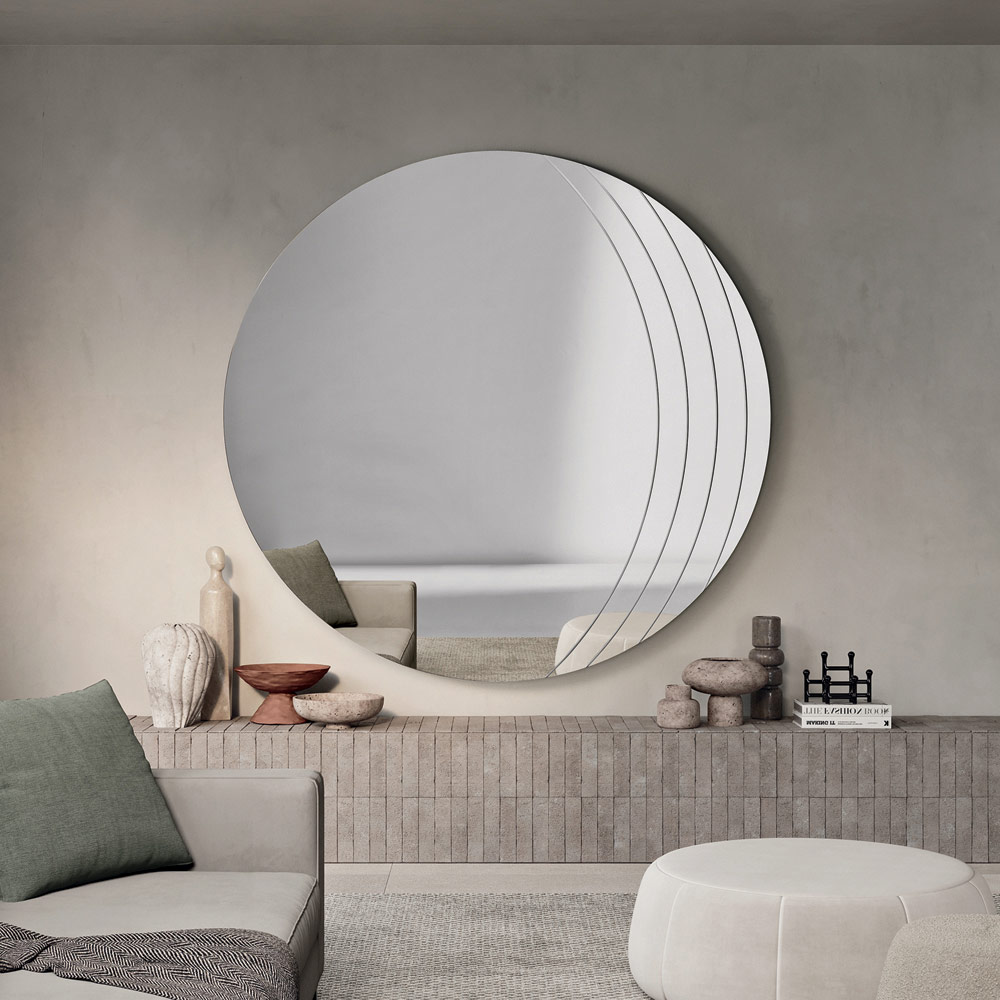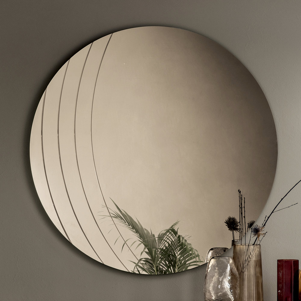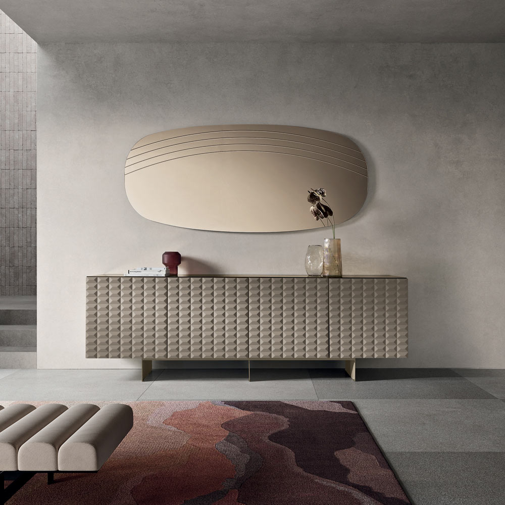 Die reflektierende Oberfläche wird durch feine seitliche Einschnitte veredelt, die der geschwungenen Form des Spiegels folgen und ein raffiniertes Spiel von Licht und Textur erzeugen. Dieses dekorative Detail verleiht dem Spiegel optische Tiefe und betont die Harmonie der Formen, wodurch er eine elegante und moderne Ausstrahlung erhält.