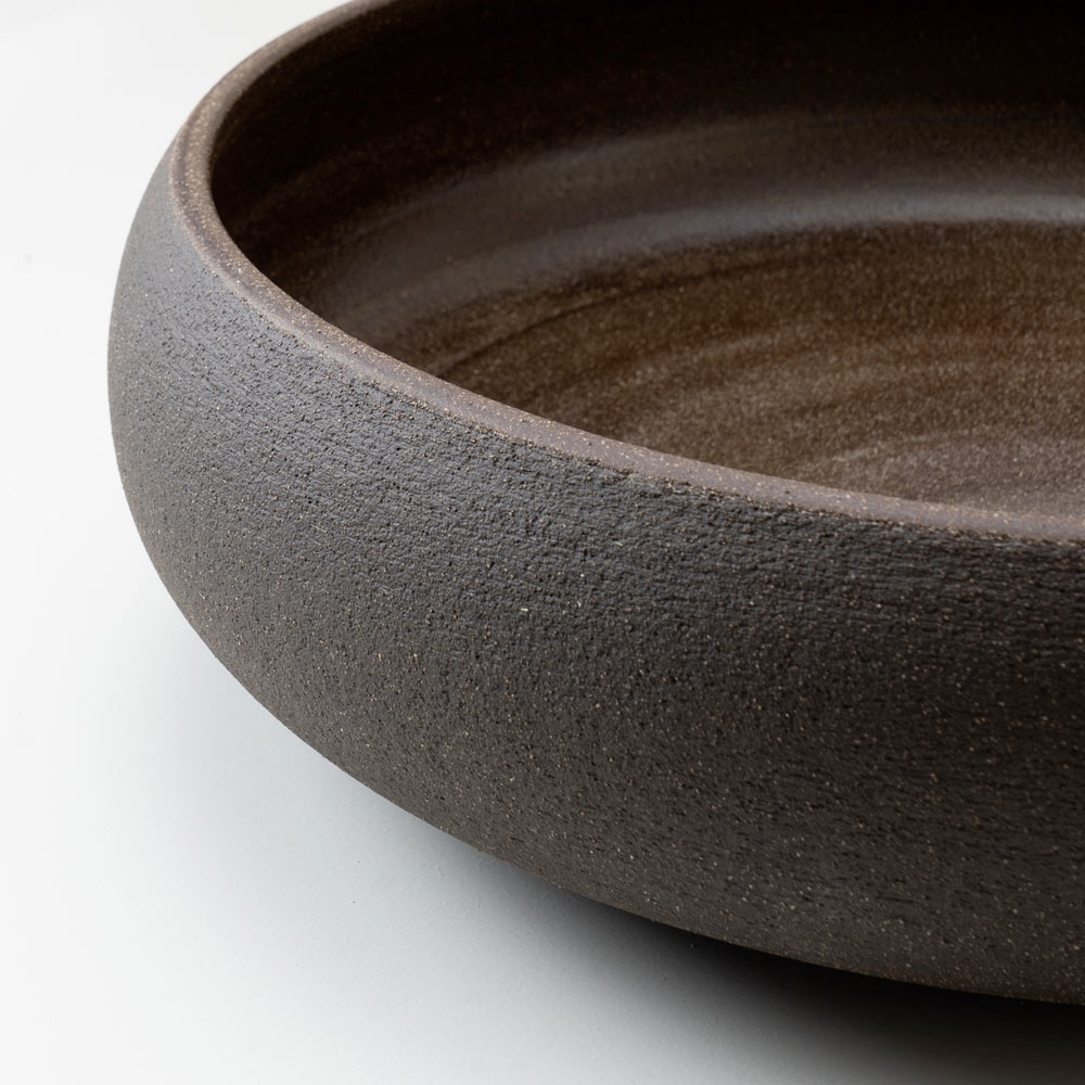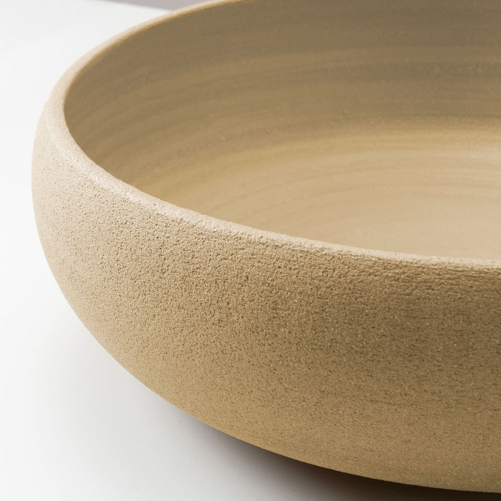 Die Innenseite ist mit einem glänzenden, transparenten Kristallglasur versehen, die für eine glatte und helle Oberfläche sorgt, während die Außenseite die strukturierte Optik von Schamotte beibehält und in zwei Farbvarianten erhältlich ist. Der Kontrast zwischen den emaillierten und den naturbelassenen Oberflächen unterstreicht den handwerklichen Charakter des Waschbeckens.