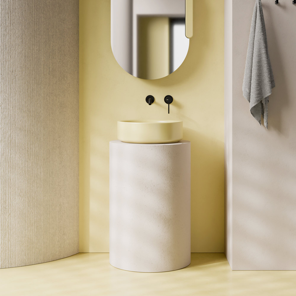 Sein leicht dicker Rand verleiht ihm Festigkeit und Präsenz, während die glatte Oberfläche seine Helligkeit verstärkt und ihn zu einem echten Blickfang der Badezimmereinrichtung macht.
