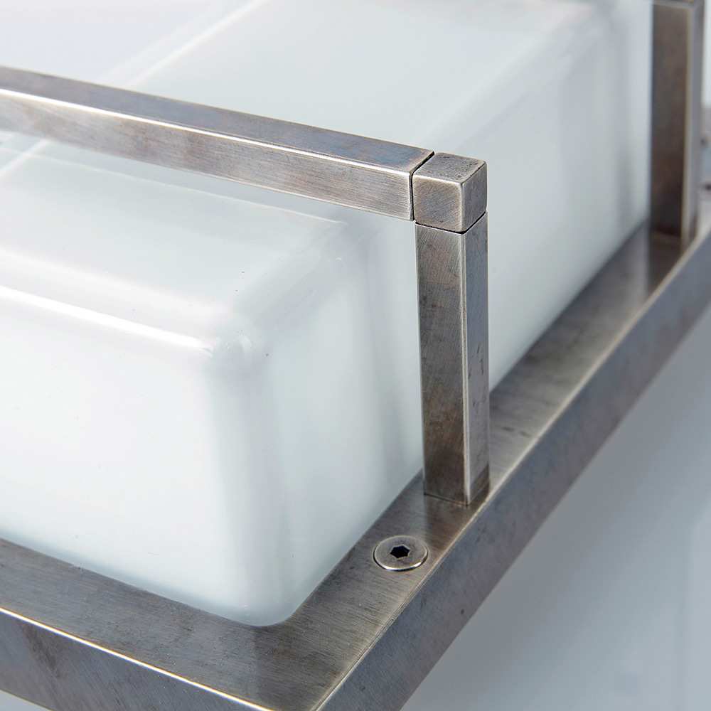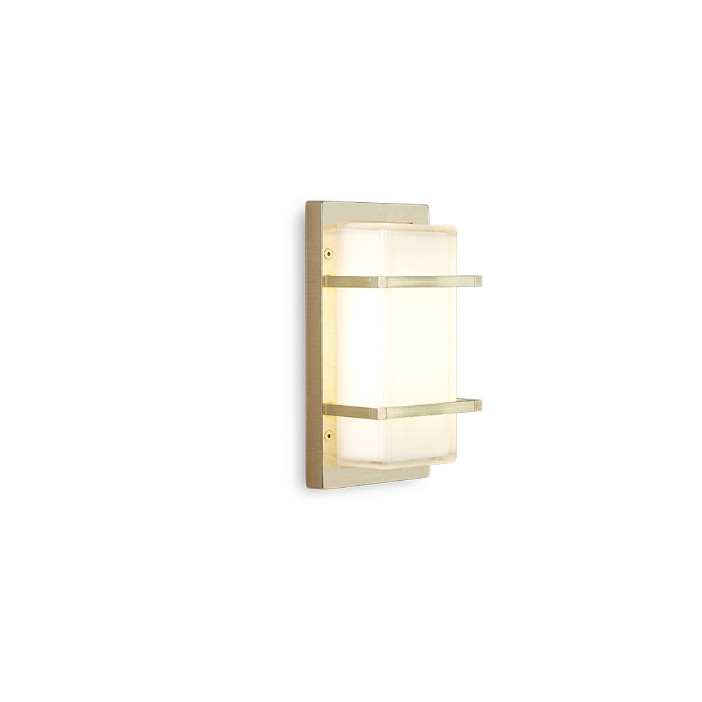 Diese schlichte und elegante, handgefertigte Wandleuchte ist eine raffinierte Beleuchtungslösung, die moderne Wände und zeitgenössische Räume perfekt in Szene setzt. Die Struktur aus Messingdruckguss in Kombination mit einem rechteckigen Diffusor aus Opalglas erzeugt ein weiches, gleichmäßiges Licht – ideal für eine einladende und zugleich funktionale Beleuchtung.
