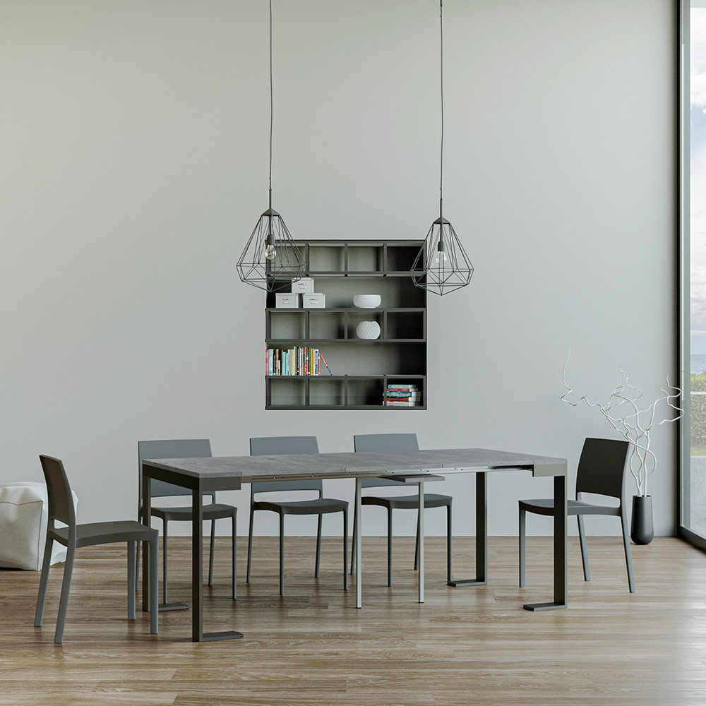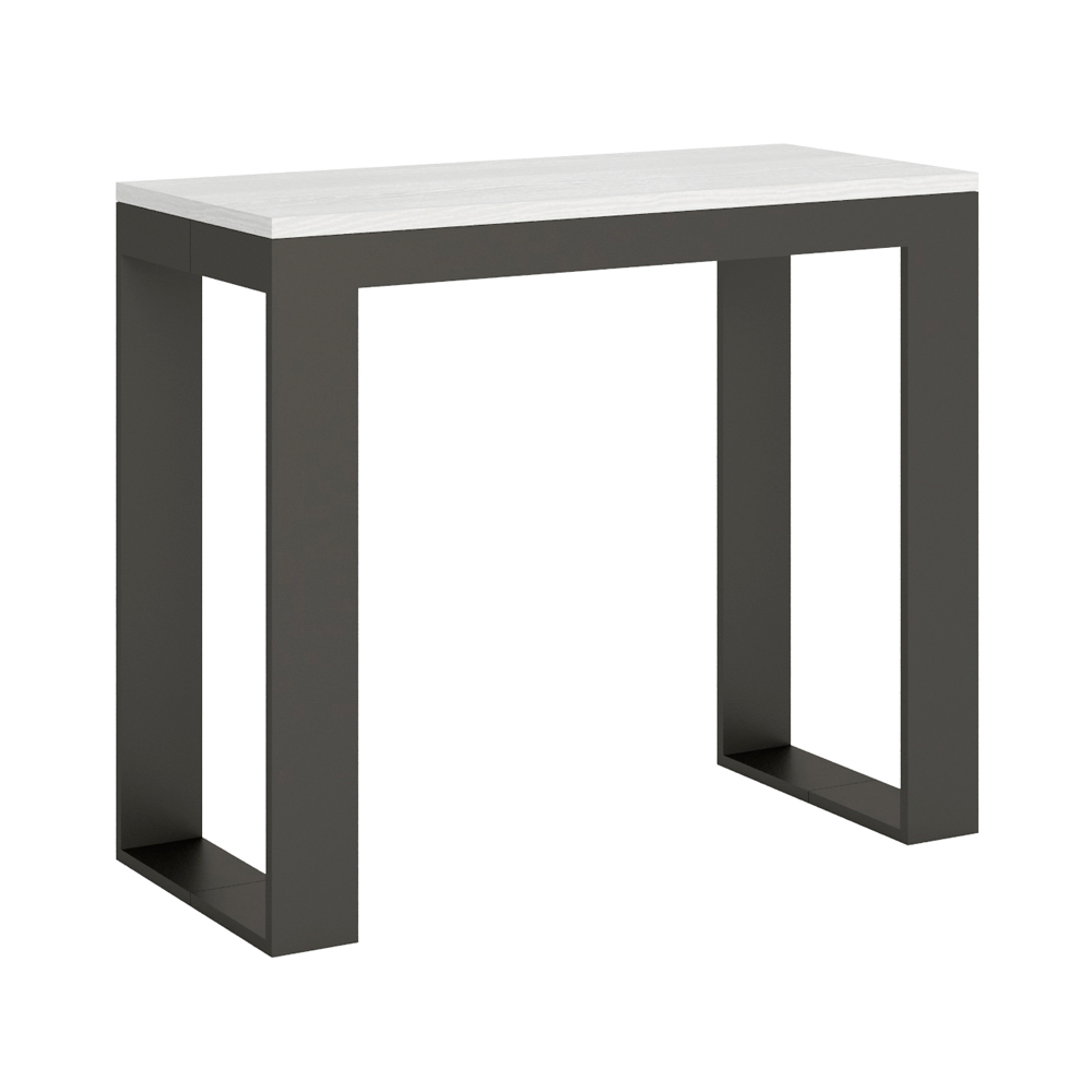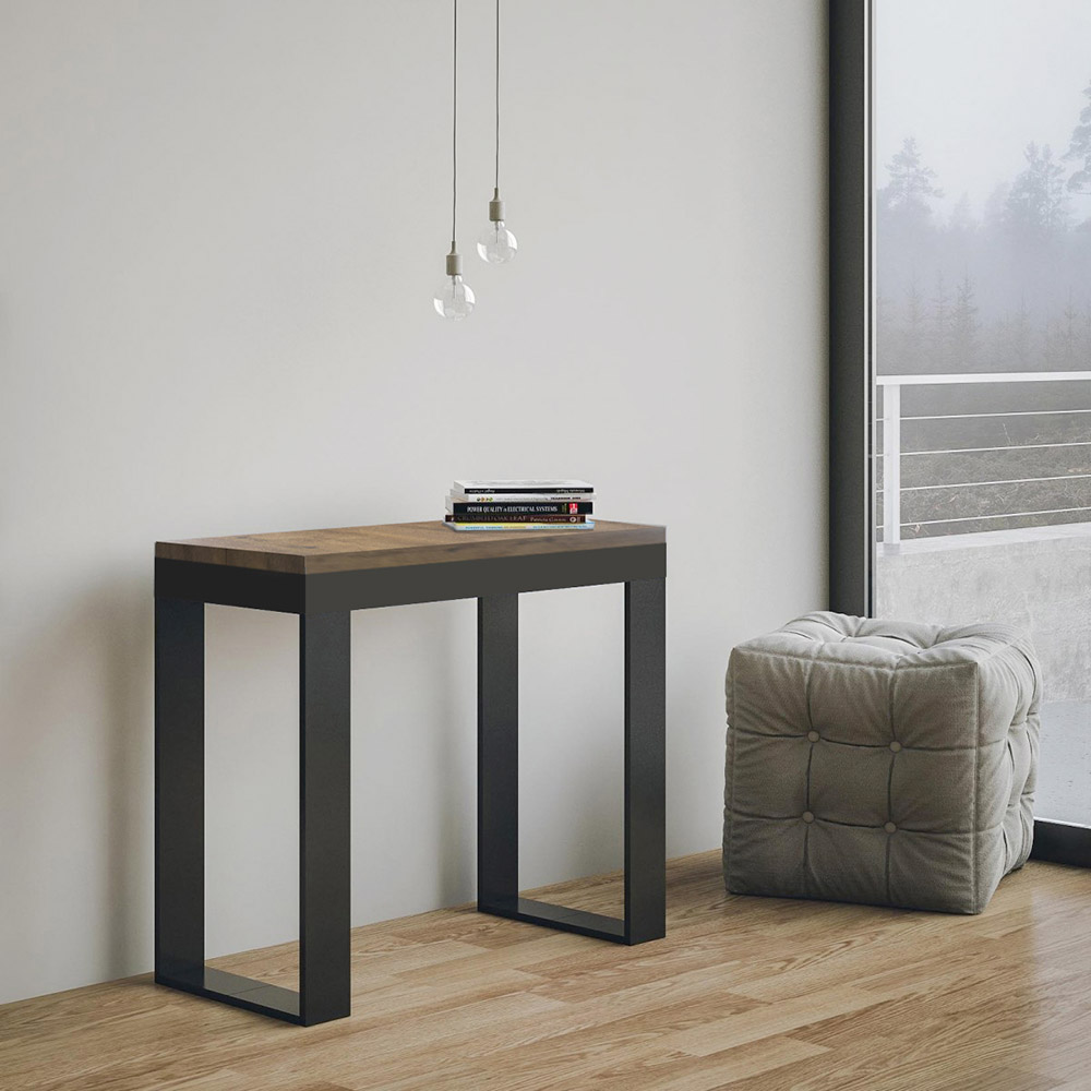 Ausziehbarer Konsolentisch mit einer Platte aus furniertem Holz und einem Gestell aus Anthrazit lackiertem Eisen, komplett Made in Italy. Der Konsolentisch è hat einen umlaufenden Rahmen aus Metall, der einen angenehmen Kontrast zur Platte aus furniertem Holz bildet und die Ästhetik des Tisches unterstreicht. Der Konsolentisch wird mit einer Metall-Mittelstütze geliefert, die dem Tisch zusätzliche Stabilität und Zuverlässigkeit verleiht, wenn er vollständig ausgezogen ist.