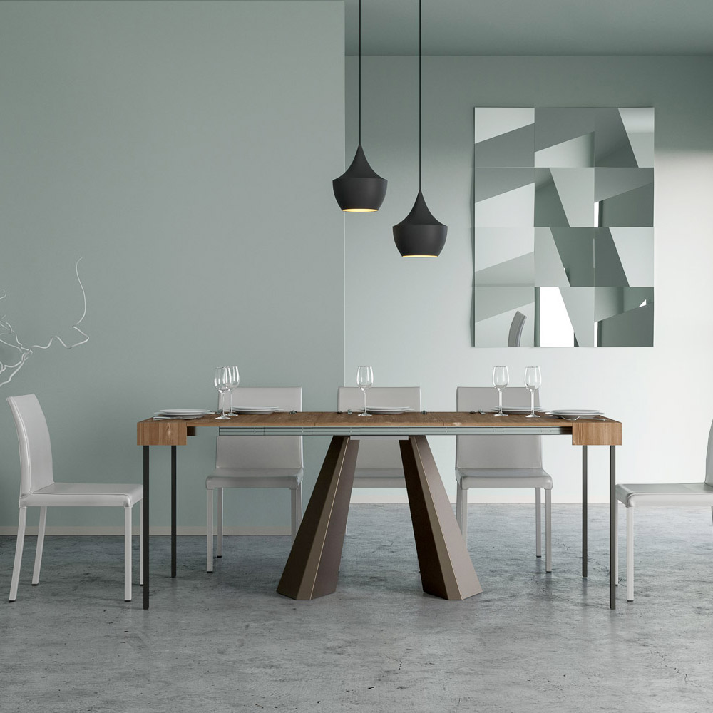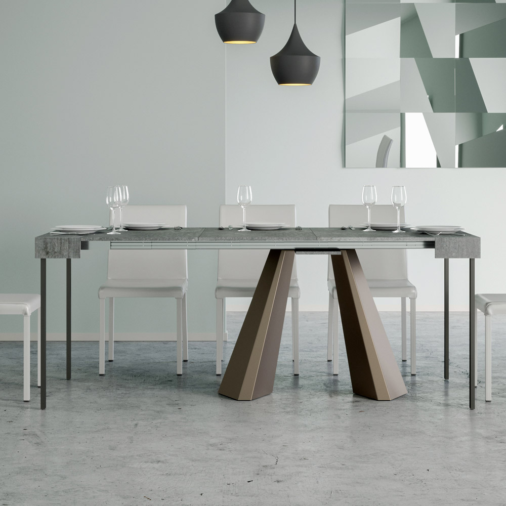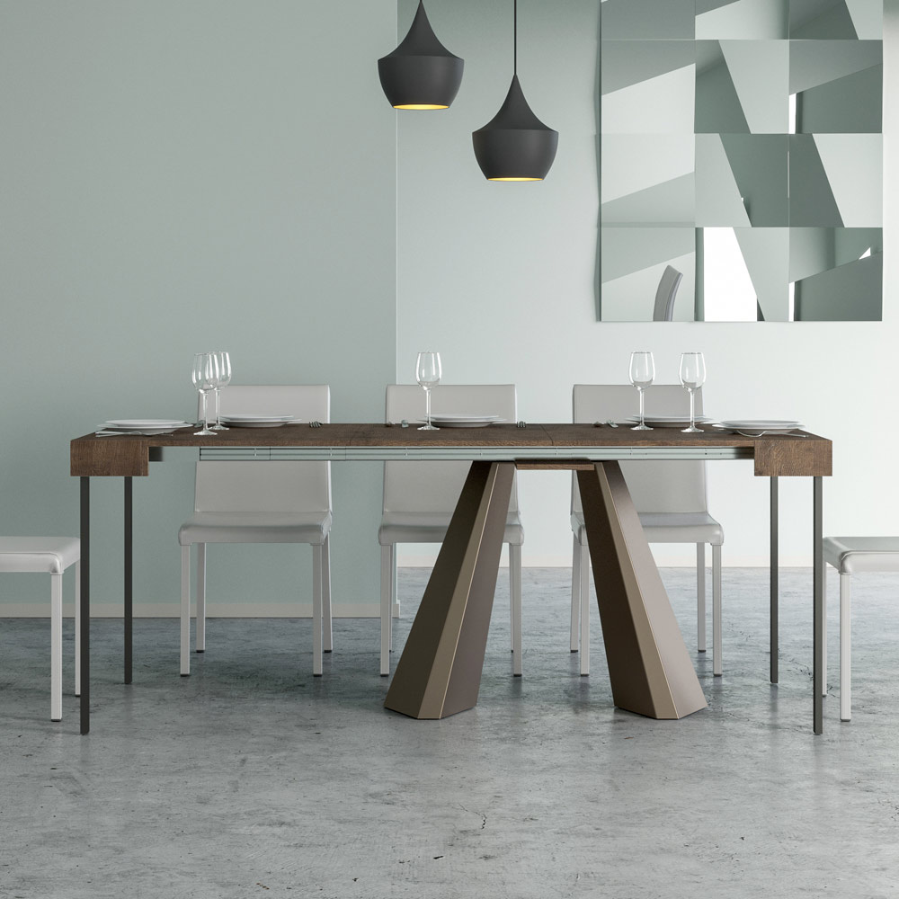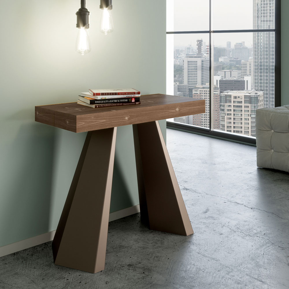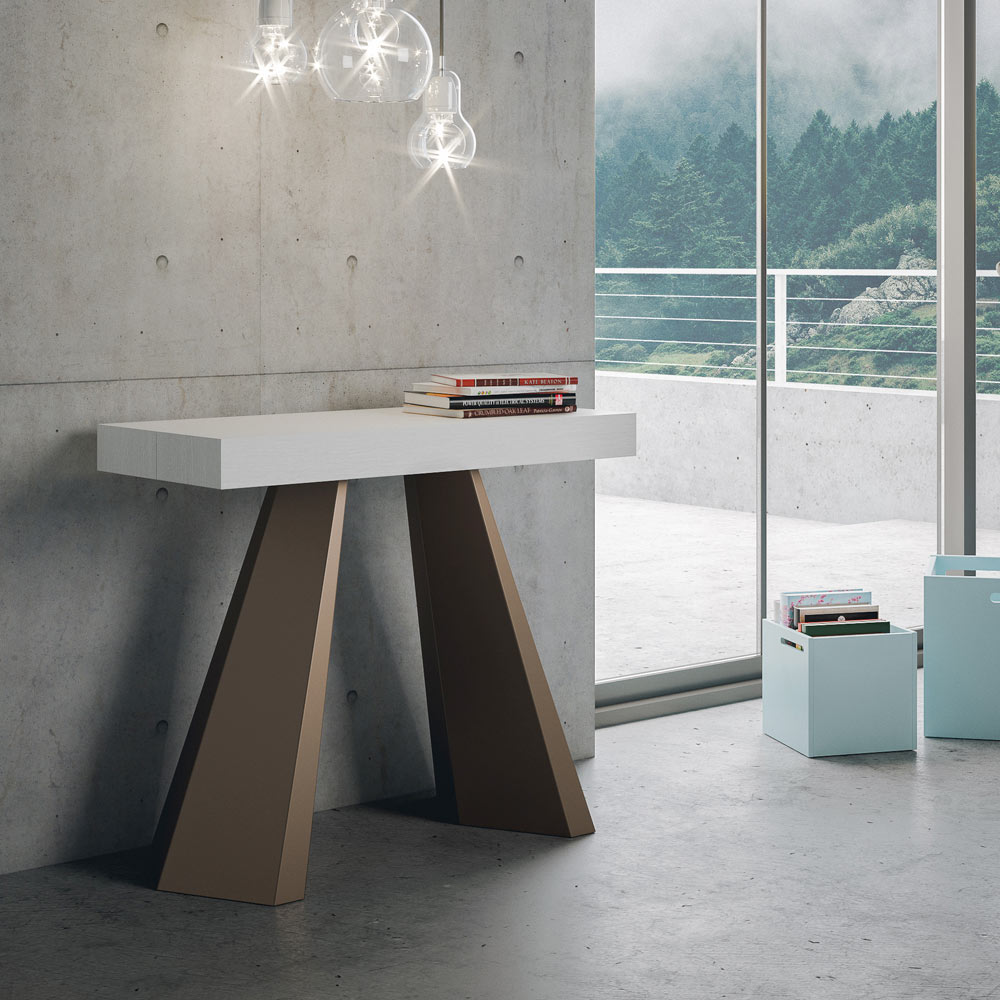 Die Einzigartigkeit dieses Konsolentisches liegt in seinen Beinen, die an die geometrischen Formen der modernen Architektur erinnern und ein kulturelles und avantgardistisches Aussehen bieten. Dank seines ausziehbaren Systems verwandelt dieses Möbelstück jeden Raum von einfach zu außergewöhnlich, indem es sich ausdehnt, um gesellschaftliche Anlässe zu beherbergen oder um die zusätzliche Fläche zu bieten, die Sie brauchen.