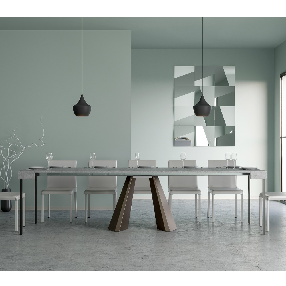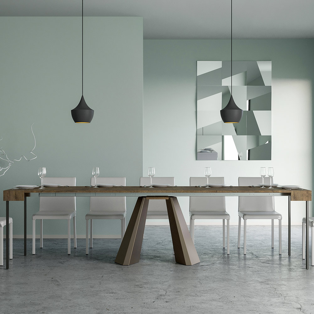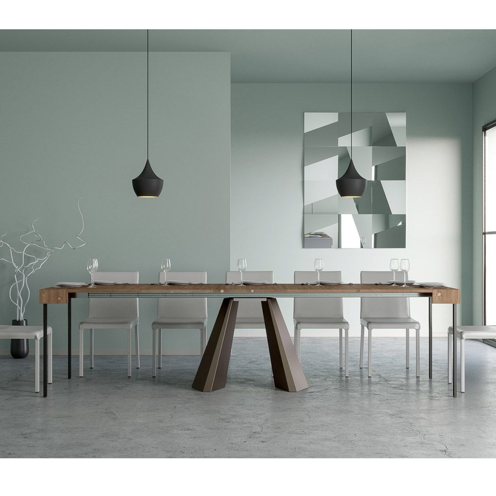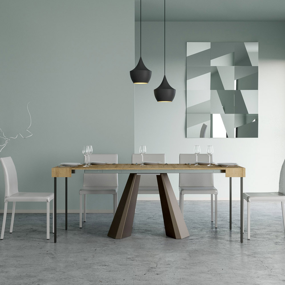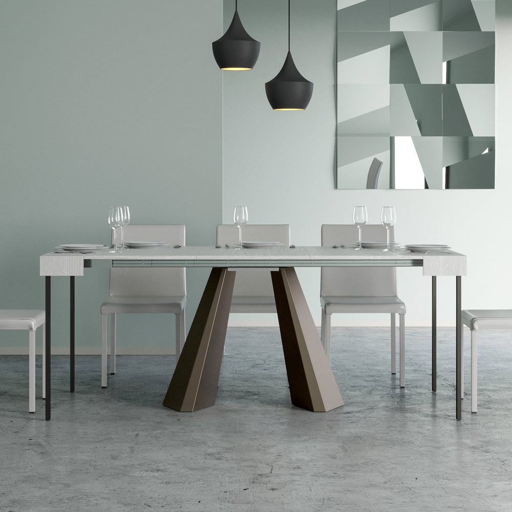Die Einzigartigkeit dieses Konsolentisches liegt in seinen Beinen, die an die geometrischen Formen der modernen Architektur erinnern und ein kulturelles und avantgardistisches Aussehen bieten. Dank seines ausziehbaren Systems verwandelt dieses Möbelstück jeden Raum von einfach zu außergewöhnlich, indem es sich ausdehnt, um gesellschaftliche Anlässe zu beherbergen oder um die zusätzliche Fläche zu bieten, die Sie brauchen.