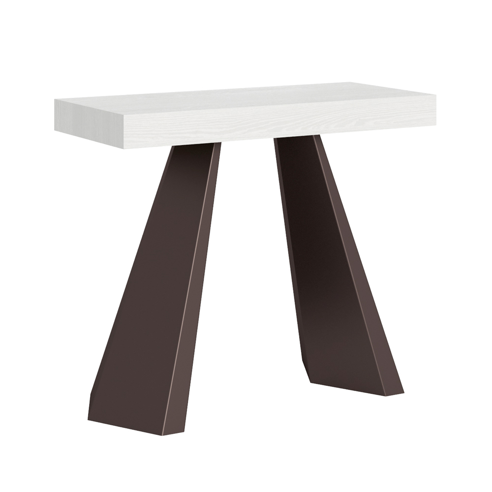 Dieser ausziehbare Konsolentisch è eine Ode an zeitgenössisches Design und dynamische Funktionalität. Die Oberfläche aus bearbeitetem Holz, fein bearbeitet, um die natürliche Maserung hervorzuheben, ruht auf zwei stabilen, schrägen Eisenbeinen, die einen ebenso kühnen wie harmonischen visuellen Kontrast bilden.