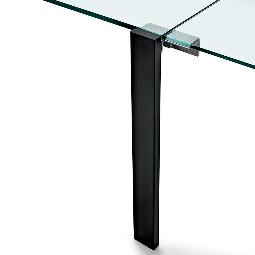 Bestehend aus einem Oberteil und Verlängerungen aus extraklarem Glas (15/10 mm dick). Die Tischplatte lässt sich mittels eines Kippmechanismus , der die Verlängerungsflügel anhebt, erweitern.