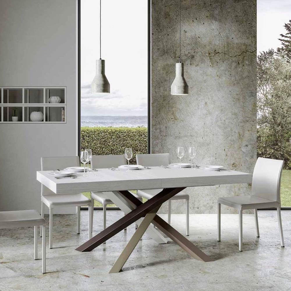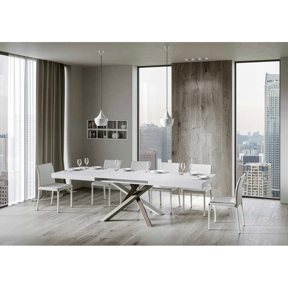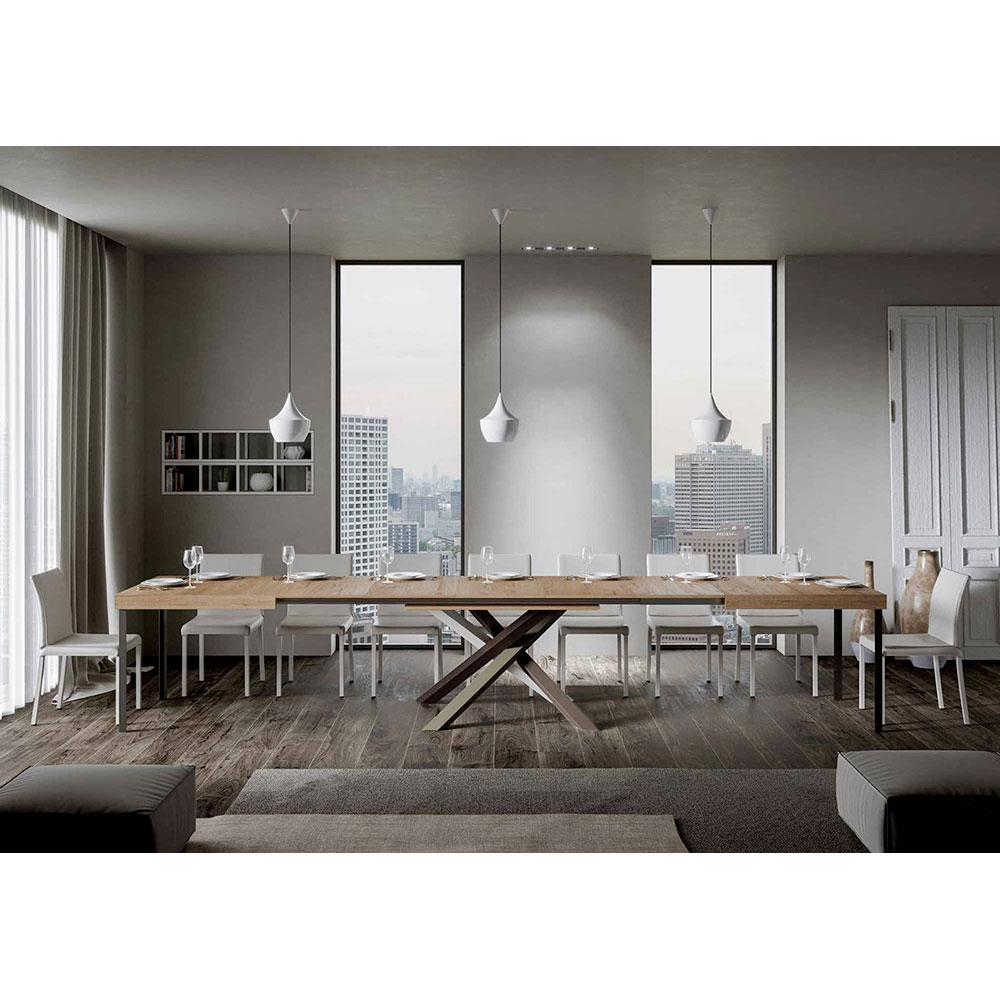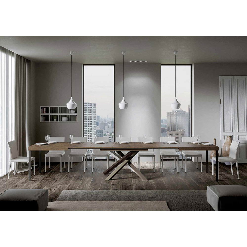 Entdecke den ausziehbaren Tisch, ein Meisterwerk des modernen Designs, das sich durch seine einzigartige Silhouette und vielseitige Funktionalität auszeichnet. Die Holzplatte verleiht dem Raum Helligkeit und bietet eine glatte und robuste Oberfläche, die zum täglichen Gebrauch einlädt. Der Tischfuß ist ein wahres geometrisches Spektakel, mit gekreuzten Beinen, die sich in einem Farbenspiel verflechten. Die vorgeschlagene Kombination ist: Fuß 1: Reinweiß (RAL 9010). Schenkel 2: Blassbraun (RAL 8025). Schenkel 3: Olivgrau (RAL 7002). Schenkel 4: Schokoladenbraun (RAL 8017). RAL-Farben sind opak. Diese Kombination verleiht dem Design nicht nur einen Hauch von Vitalität, sondern sorgt auch für Stabilitätà und Festigkeit. Der Tischauszug ist ebenso einfach wie technisch und ermöglicht die Verwandlung dieses eleganten Möbelstücks von einem praktischen Tisch für vier Personen in einen gemütlichen Bereich für Abendessen und größere Zusammenkünfte.