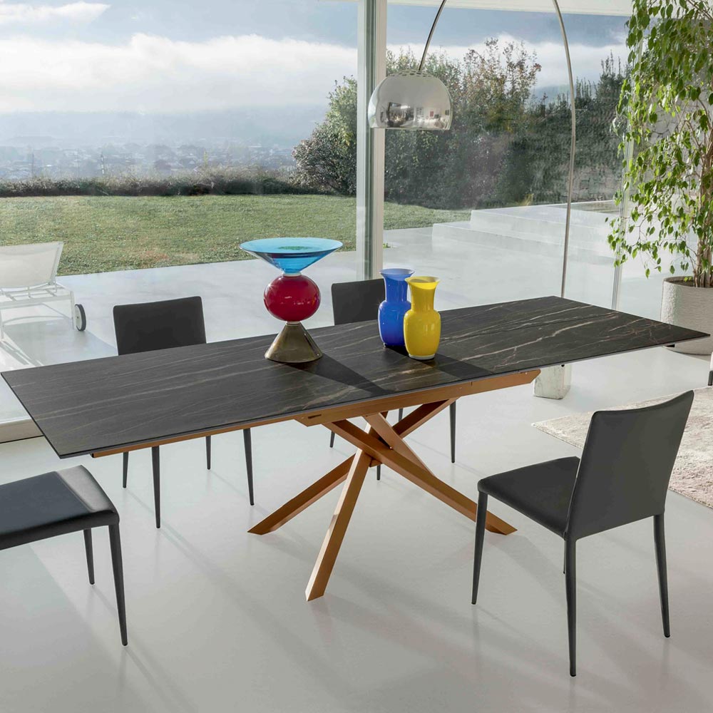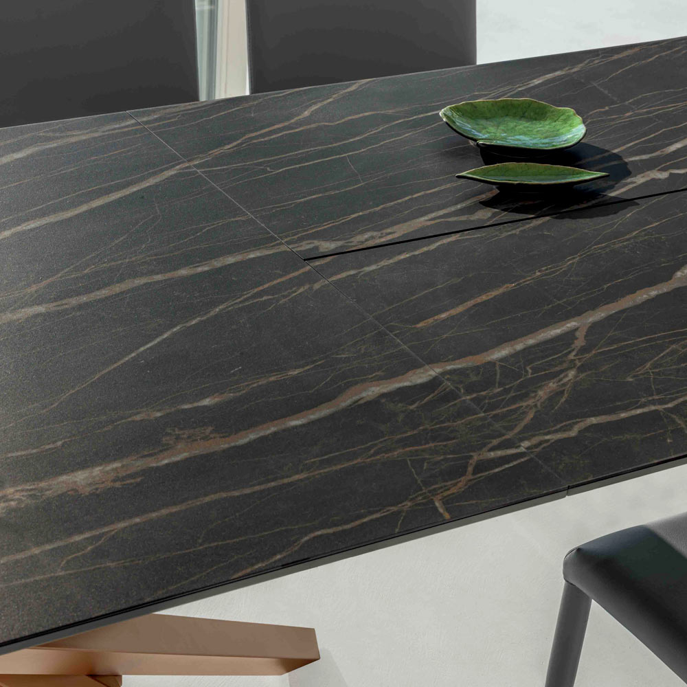 Platte aus matt-schwarzer Desir-Keramik, Verlängerung aus matt-schwarzer Desir-Keramik mit durchgehender Maserung und Metallsockel in geprägtem Kupferfinish