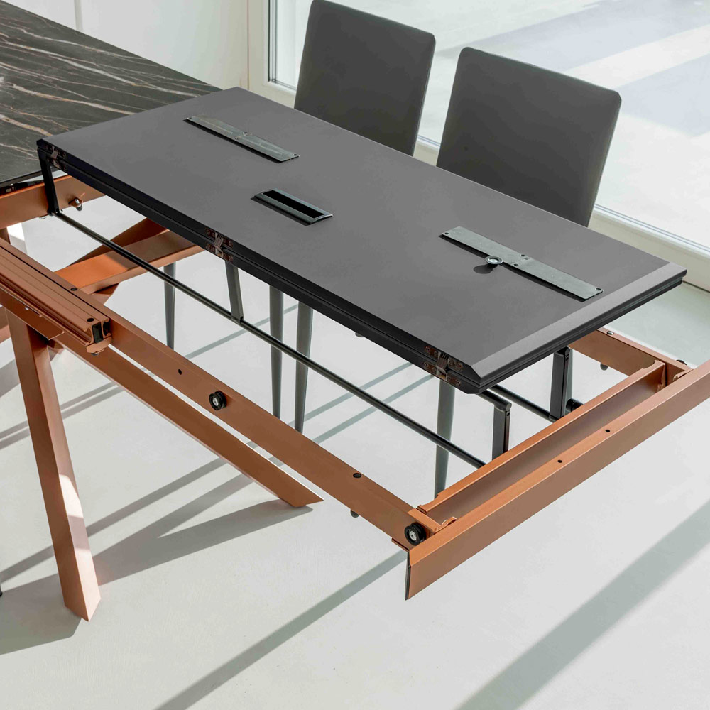 Der Tisch stellt die perfekte Synthese aus modernster Technik und ästhetischem Design dar. Dies ist nicht einfach nur ein ausziehbarer Tisch, sondern ein funktionales Kunstwerk, entworfen für diejenigen, die keine Kompromisse zwischen Stil und Platz eingehen möchten.