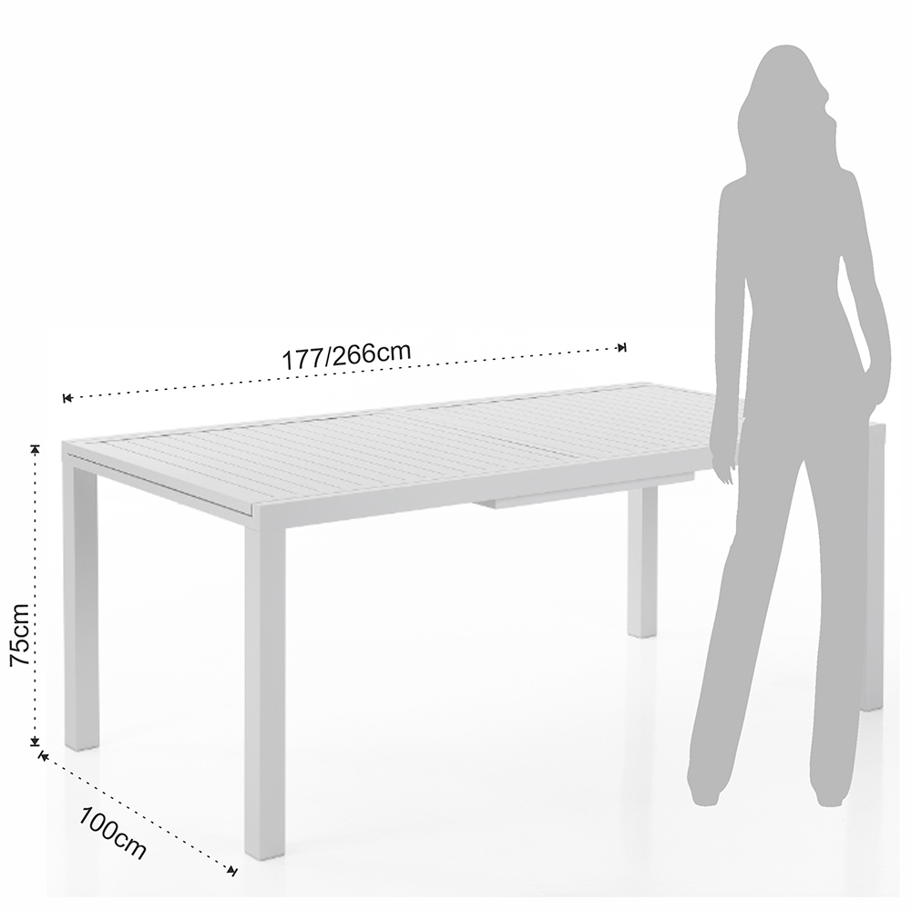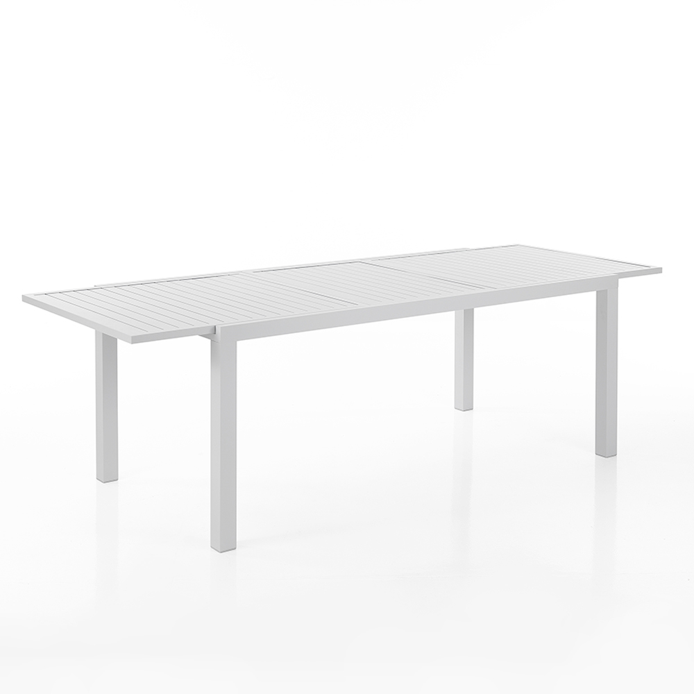 Ausziehbarer Tisch für den Außen- und Innenbereich mit Aluminiumstruktur, die für die Außenseite mit mattweißer Schutzfarbe lackiert ist , Platte aus Aluminiumlatten, die für die Außenseite mit mattweißer Schutzfarbe lackiert sind. Die Verlängerung wird unter der Tischplatte positioniert.