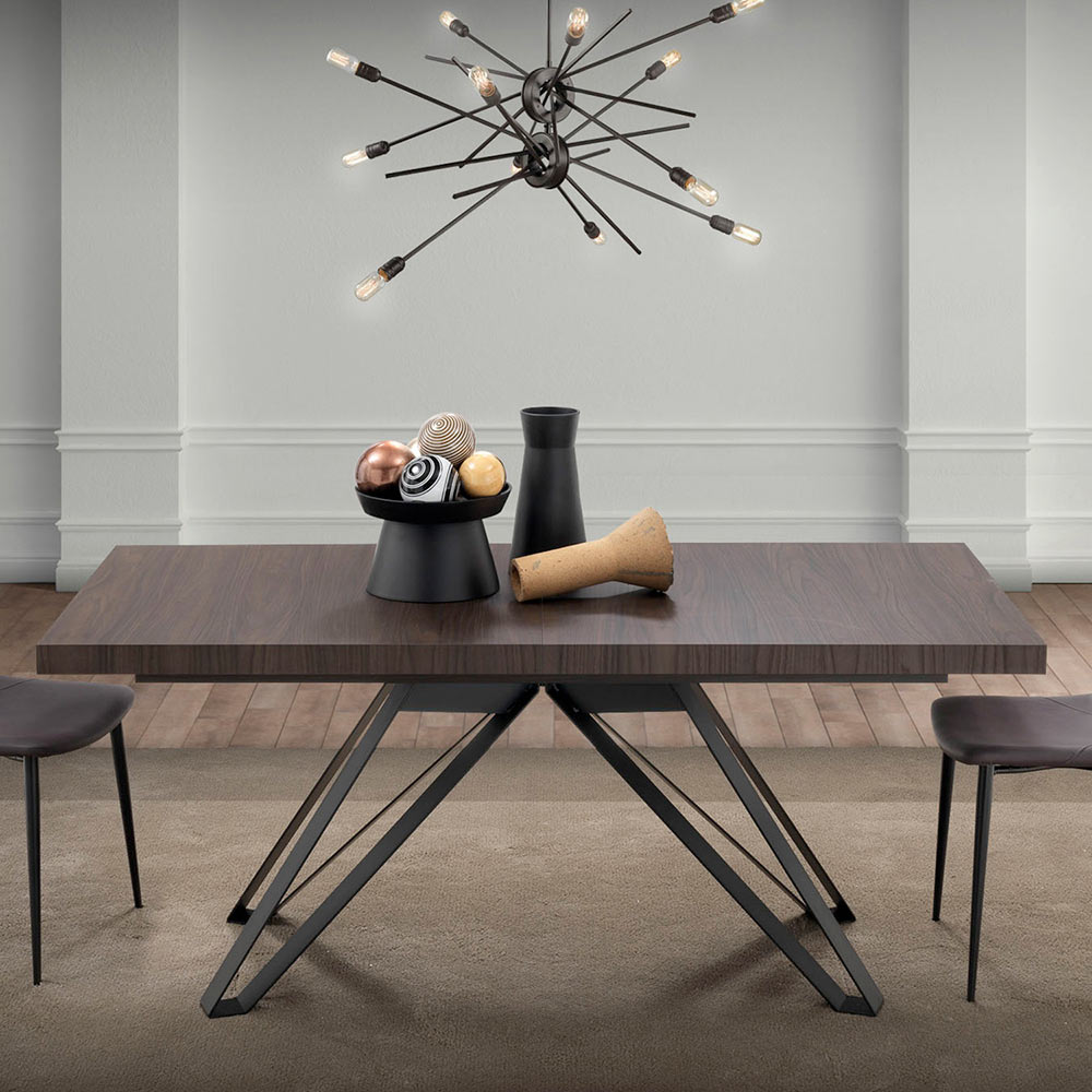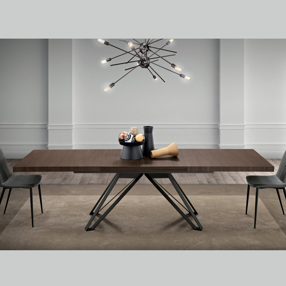 Die Beine aus schwarzem Metall in Form eines umgedrehten A zeichnen sich durch ihre geometrische Struktur und ihr mattes Finish aus und sind ein Beispiel dafür, wie Funktionalität und Stil harmonisch miteinander verschmelzen können. Das Design ermöglicht eine einfache Verlängerung des Tisches, sodass er sowohl für den alltäglichen Gebrauch als auch für besondere Anlässe geeignet ist.