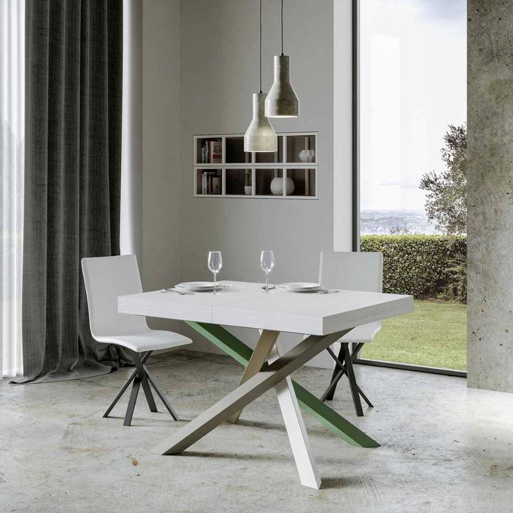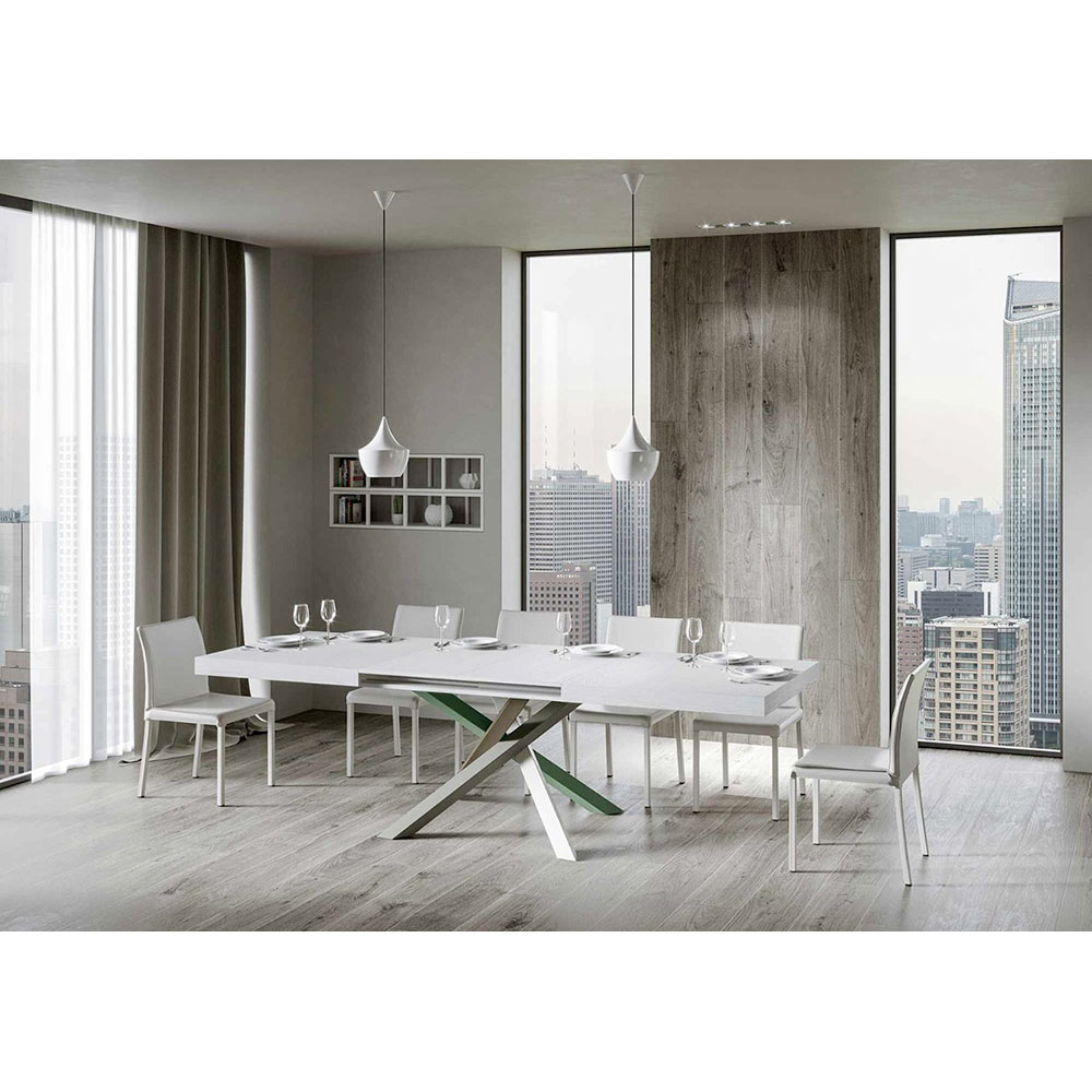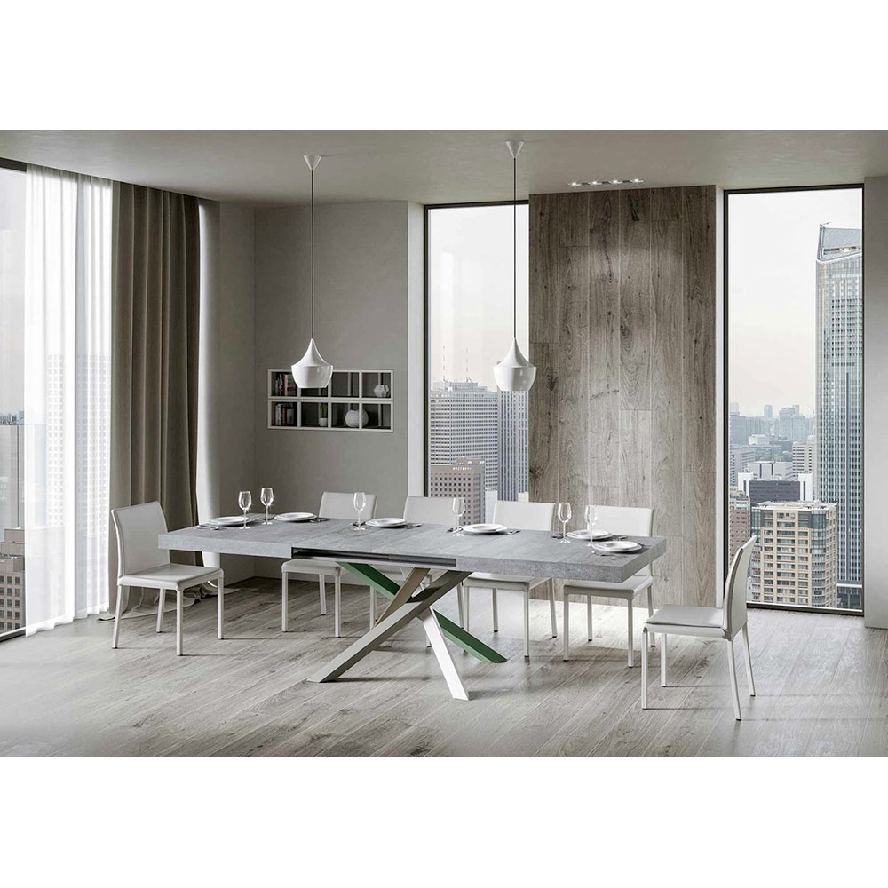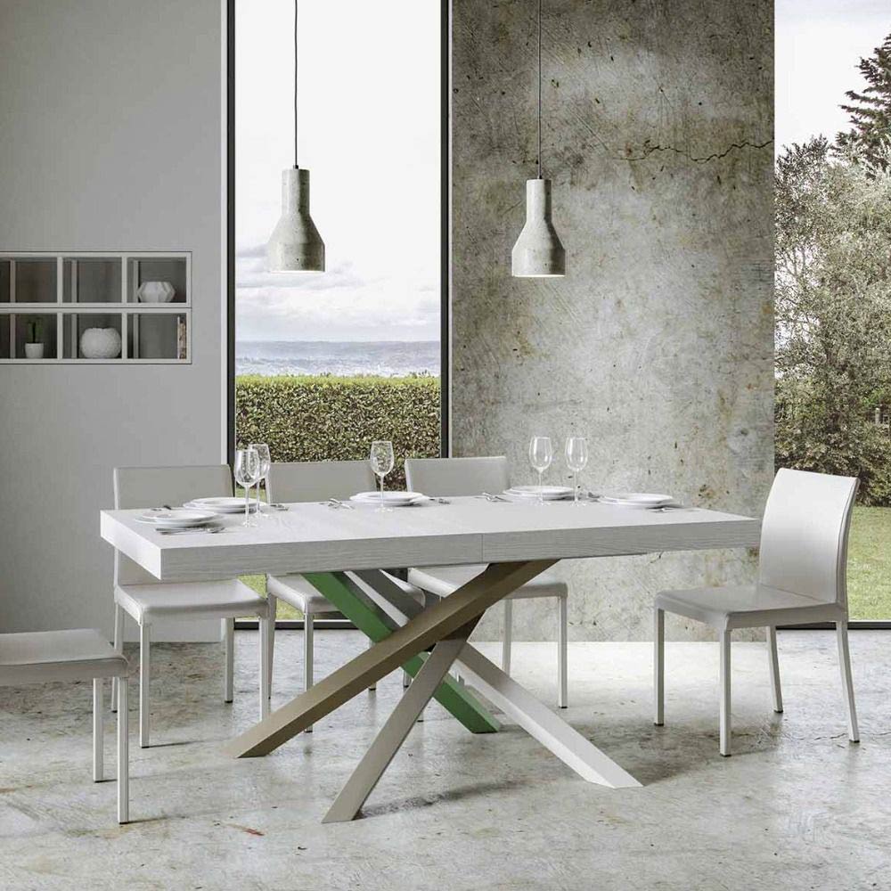Entdecke den ausziehbaren Tisch, ein Meisterwerk des modernen Designs, das sich durch seine einzigartige Silhouette und vielseitige Funktionalität auszeichnet. Die Holzplatte verleiht dem Raum Helligkeit und bietet eine glatte und robuste Oberfläche, die zum täglichen Gebrauch einlädt. Der Tischfuß ist ein wahres geometrisches Spektakel, mit gekreuzten Beinen, die sich in einem Farbenspiel verflechten. Die vorgeschlagene Kombination ist: Fuß 1: Reinweiß (RAL 9010). Schenkel 2: Moosgrau (RAL 7003). Schenkel 3: Olivgrau (RAL 7002). Schenkel 4: Resedagrün (RAL 6011). Die RAL-Farben sind opak. Diese Kombination verleiht dem Design nicht nur einen Hauch von Vitalität, sondern sorgt auch für Stabilität und Festigkeit. Der Mechanismus zur Tischverlängerung ist einfach wie technisch und ermöglicht es, dieses elegante Möbelstück von einem praktischen Tisch für vier Personen in einen gemütlichen Bereich für Abendessen und größere Zusammenkünfte zu verwandeln.