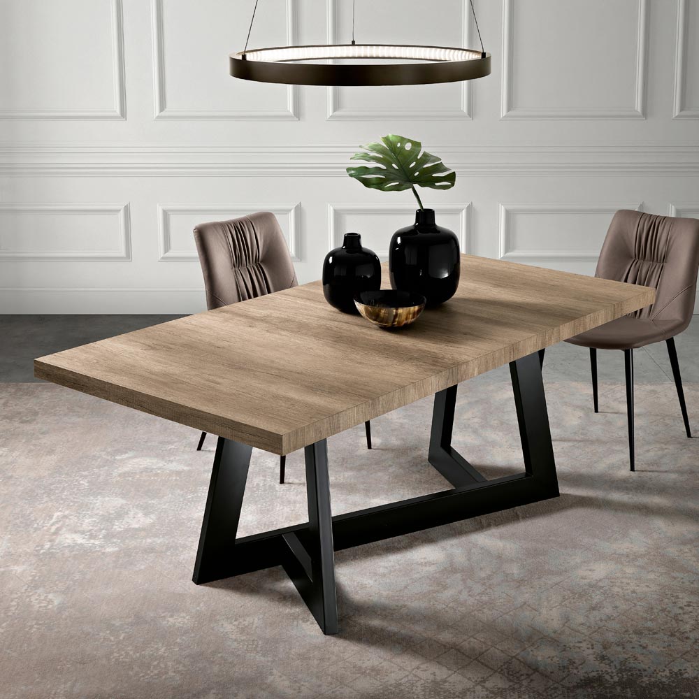 Die Struktur wird von Metallbeinen getragen, die sich in gewagten geometrischen Formen ineinander verflechten und so Solidität und avantgardistisches Design vereinen. Der Kontrast zwischen der Wärme der Holzplatte und der Industriellität des Metalls schafft eine atemberaubende visuelle Balance, wodurch dieses Stück perfekt für eine Vielzahl von Inneneinrichtungen geeignet ist, von klassisch bis modern.