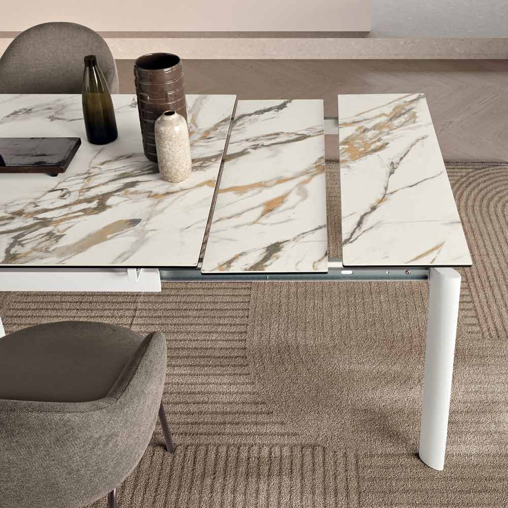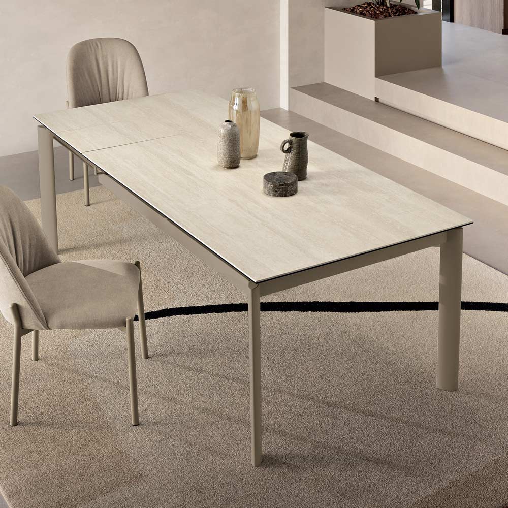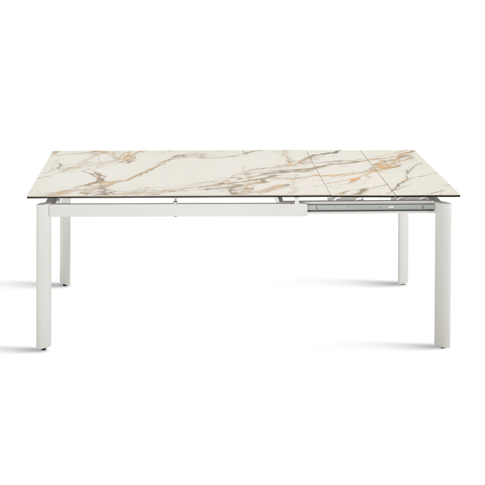 Ein eleganter Ausziehtisch im minimalistischen Design, der Ihrem Ess- oder Wohnzimmer eine stilvolle Note verleiht. Das lackierte Metallgestell trägt eine edle Tischplatte aus Feinsteinzeug in Marmoroptik , die für den praktischen und vielseitigen Gebrauch im Alltag konzipiert ist.