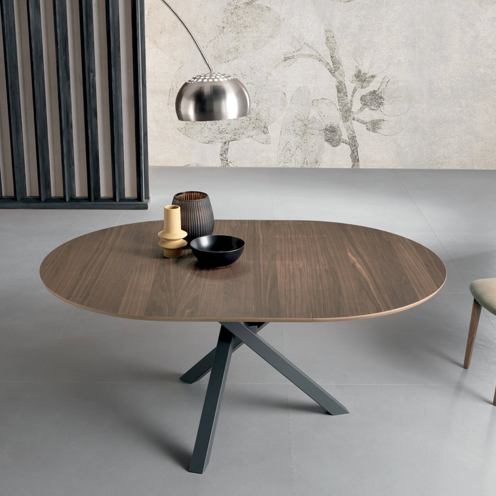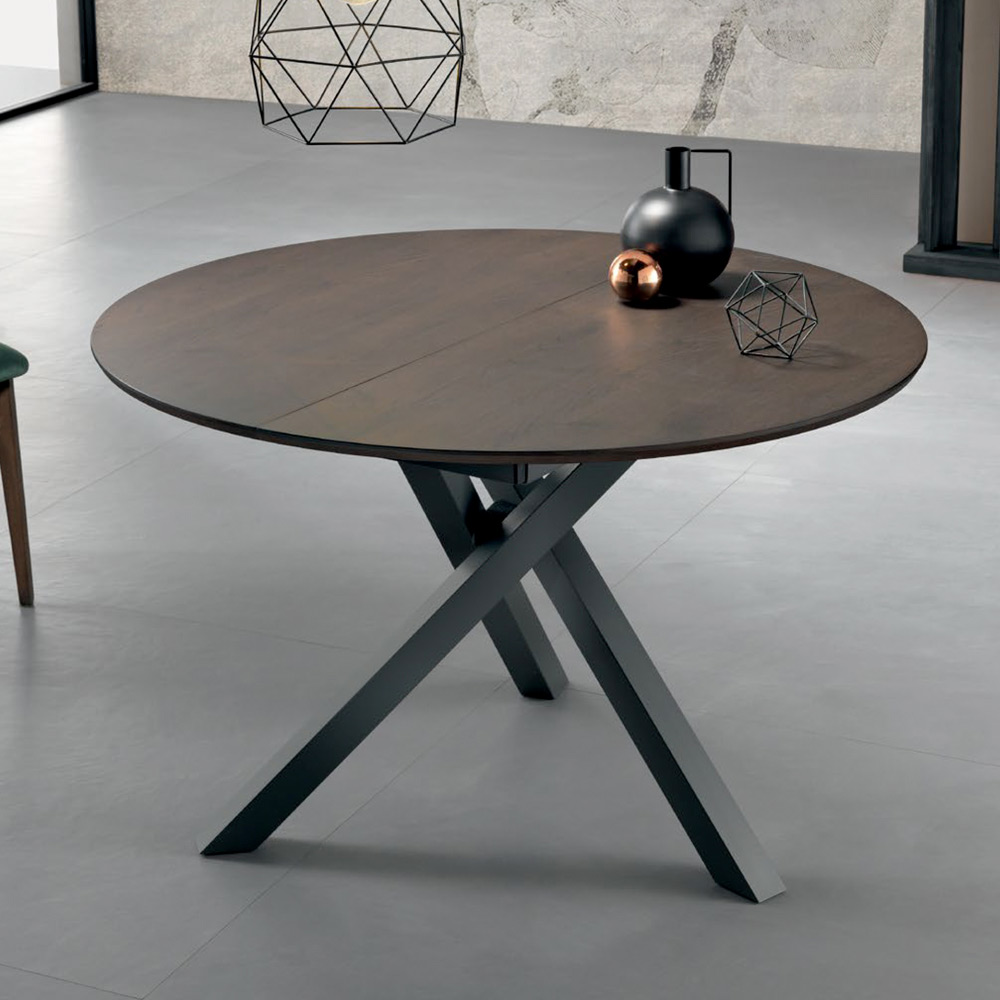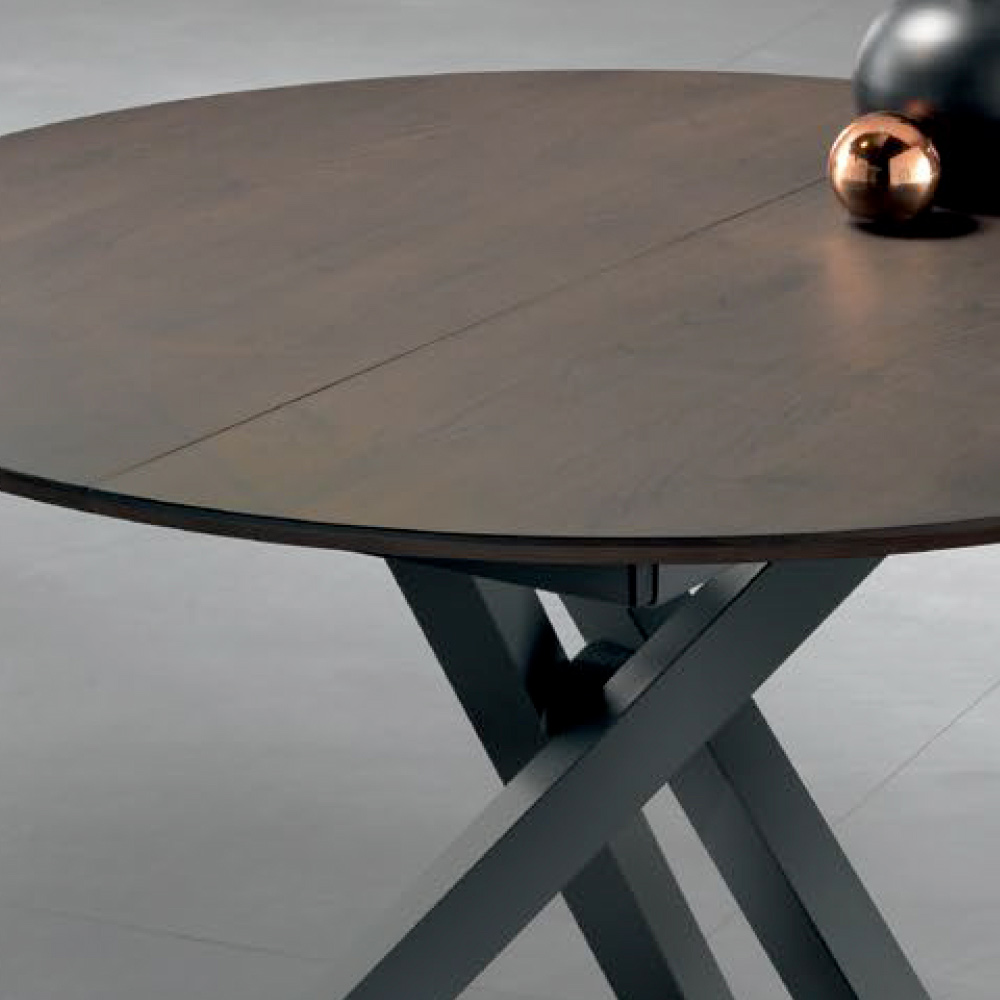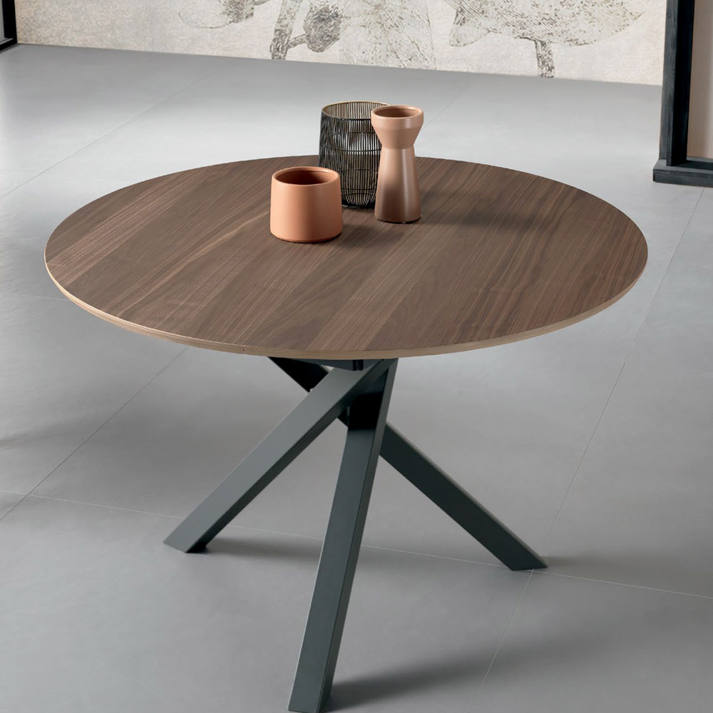 Runder Tisch, Durchmesser 120 cm, ausziehbar auf 170 cm, mit 20 mm dicker Canaletto-Nussbaumfurnierplatte und abgeschrägtem Profil.