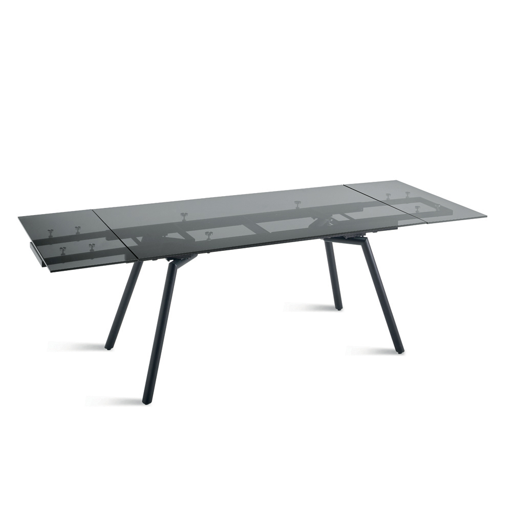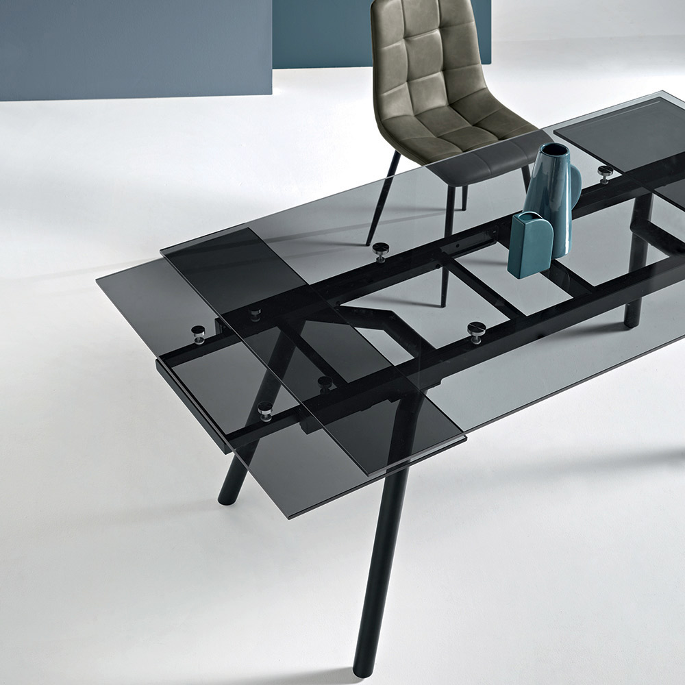 Ein eleganter, moderner Ausziehtisch , ideal für die stilvolle Einrichtung Ihres Ess- oder Wohnzimmers . Die Tischplatte aus Rauchglas verleiht dem Raum Helligkeit und optische Leichtigkeit, während das schwarz lackierte Metallgestell für Stabilität und Langlebigkeit sorgt und so eine perfekte Balance zwischen zeitgemäßer Ästhetik und Funktionalität schafft.