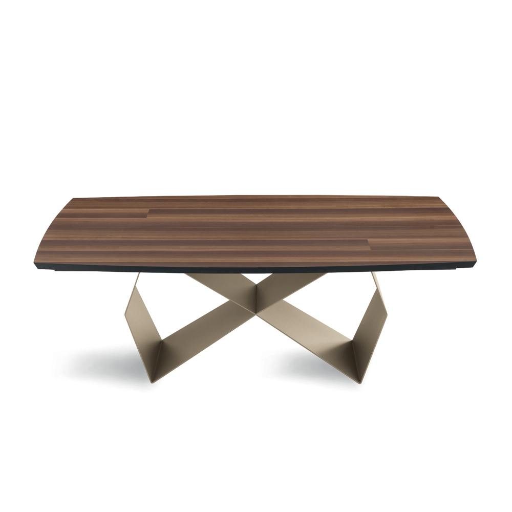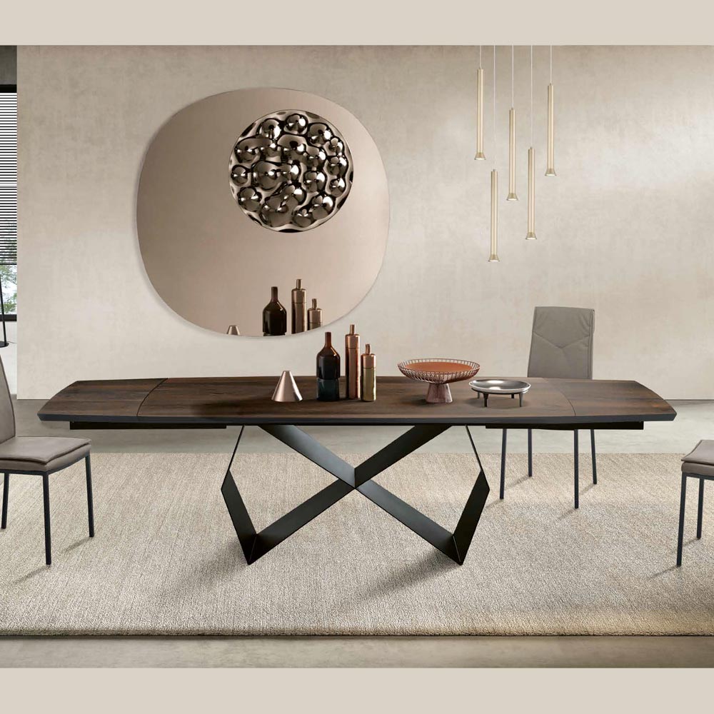 Die Metallbeine mit ihrer markanten, geometrischen Form sind lackiert und bilden einen schönen Kontrast zum Holzton. Diese Materialkombination sorgt nicht nur für solide Stabilität, sondern ist auch ein eindrucksvolles optisches Element, das diesen Tisch zu einem echten Blickfang in jedem Esszimmer oder offenen Bereich macht.