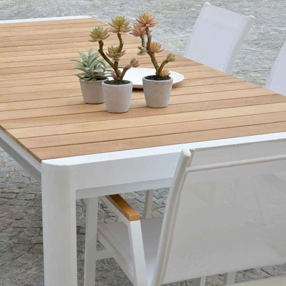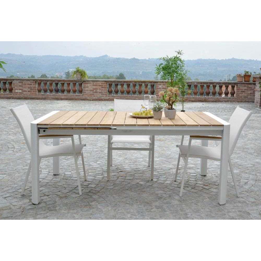 Außentisch mit weißem Aluminiumgestell und Teakholzplatte. Der Tisch kann mit einer seitlichen Schiebeöffnung auf 240 cm verlängert werden.