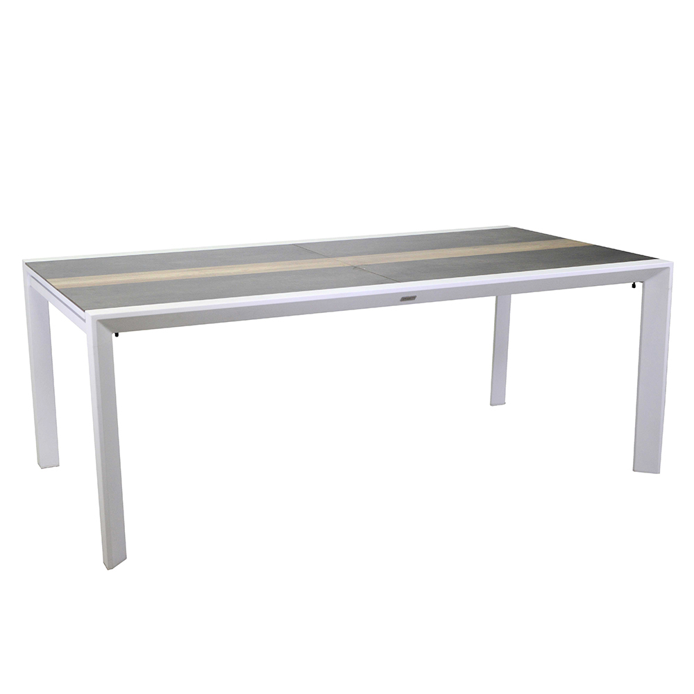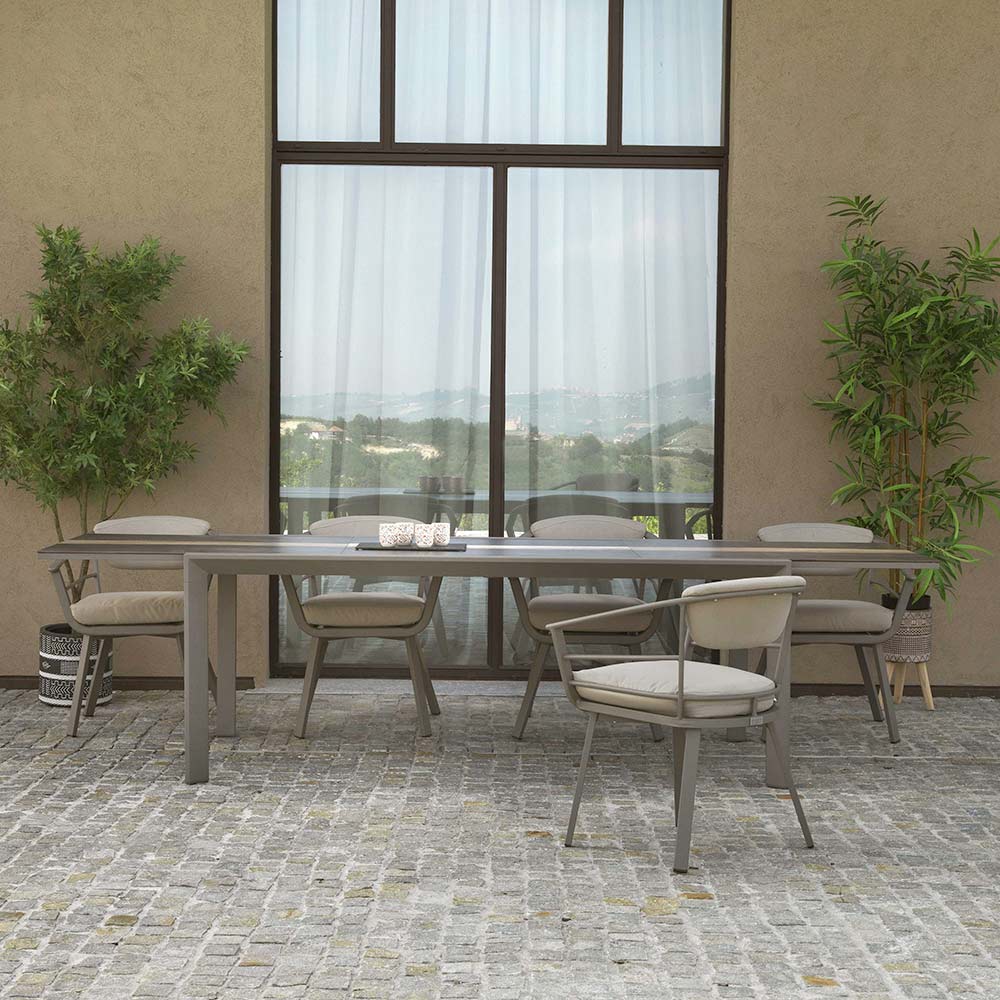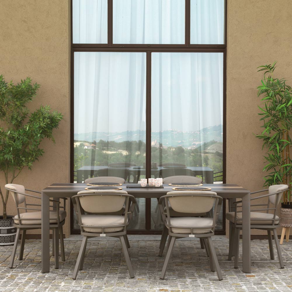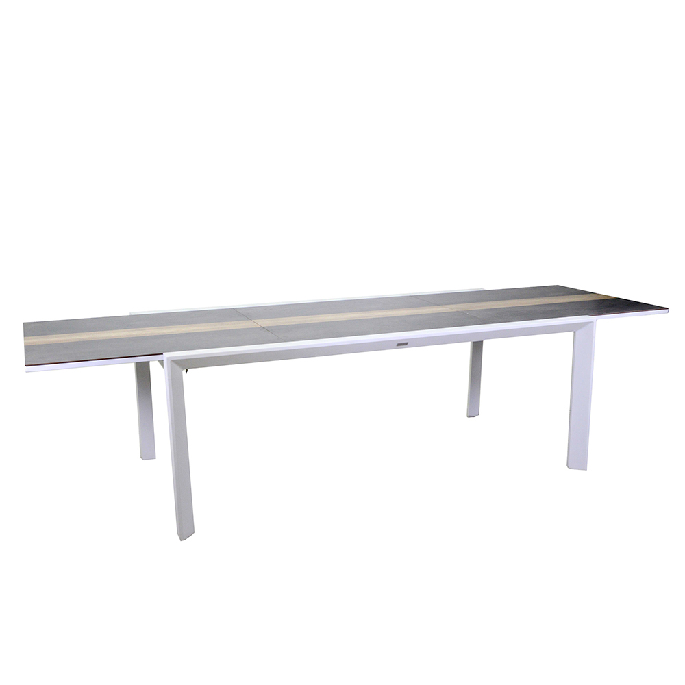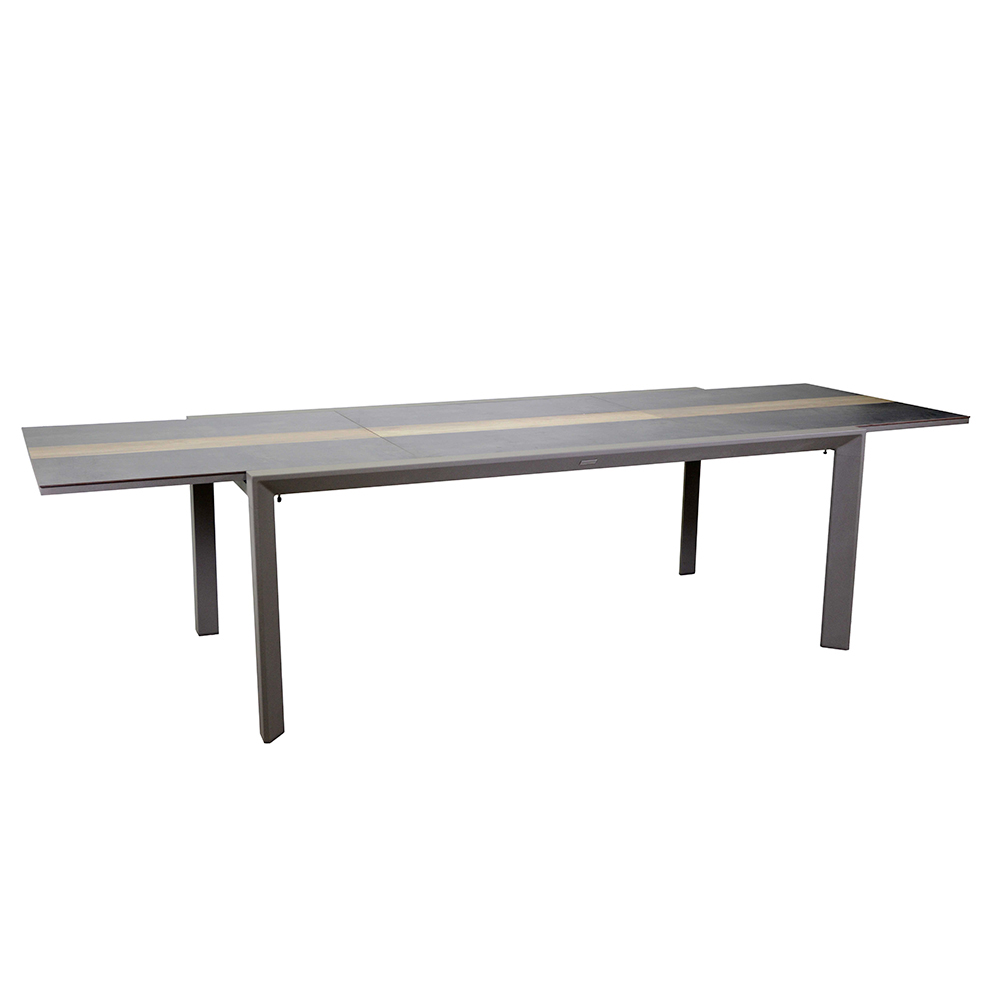 Ausgestattet mit einer zentralen Schiebeöffnung, bietet dieser Tisch eine einzigartige Flexibilität, die es Ihnen ermöglicht, ihn bei Bedarf einfach zu erweitern, was ihn perfekt für die Bewirtung von Freunden und Familie macht. Die HPL-Oberfläche ist witterungsbeständig und leicht zu reinigen, was eine langlebige und pflegeleichte Investition garantiert.