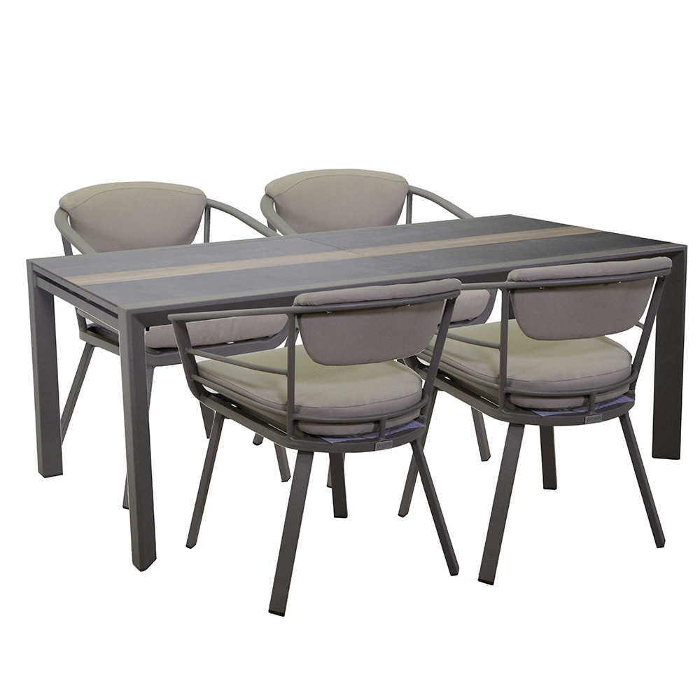 Entdecken Sie die Eleganz und Funktionalität dieses Tisches mit Gestell aus pulverbeschichtetem Aluminium, der entwickelt wurde, um Ihren Außenbereichen einen Hauch von Stil und Beständigkeit zu verleihen. Die 6 mm dicke HPL (High Pressure Laminate) Tischplatte garantiert Langlebigkeit und eine raffinierte Ästhetik. Die Oberfläche besteht aus 9 holzfarbenen Paneelen, die sich harmonisch in das moderne Design einfügen.