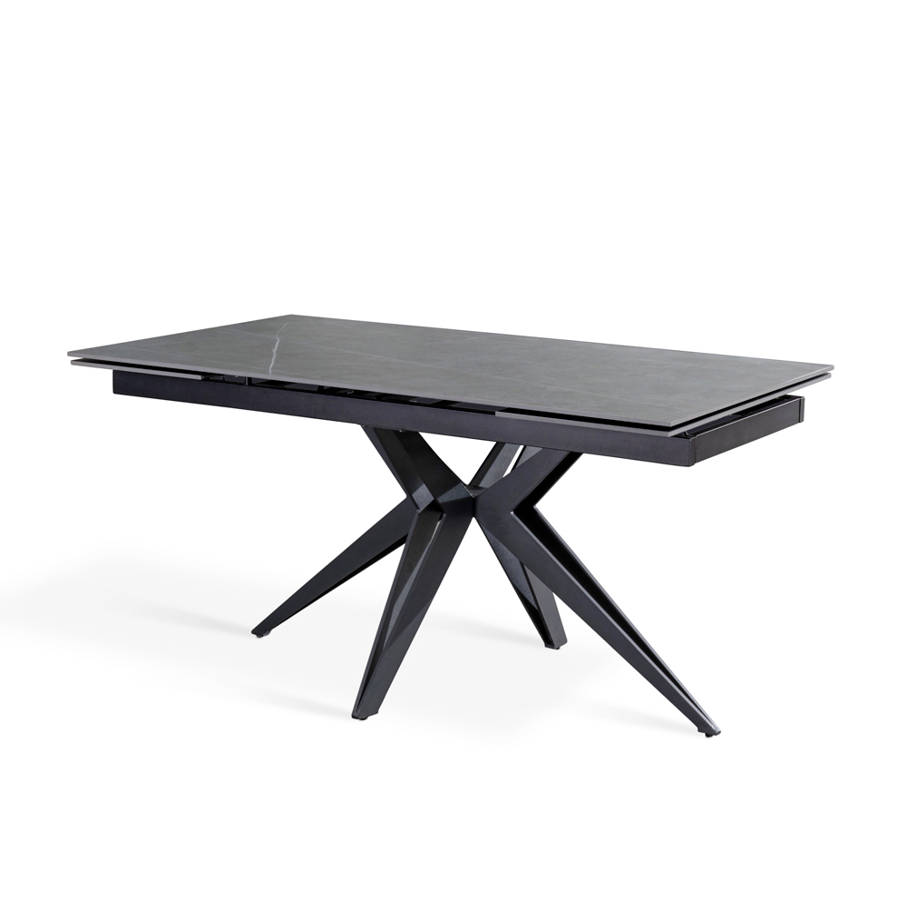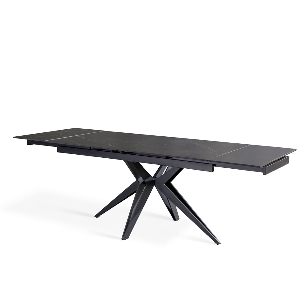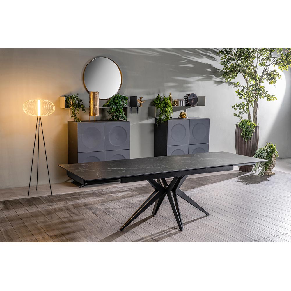 Was die Aufmerksamkeit auf sich zieht, ist die Ausdruckskraft dieses ausziehbaren Tisches im modernen und industriellen Stil. Sein Design zeichnet sich durch die elegante Tischplatte aus Keramik aus, die geschmackvoll mit dem massiven Metallgestell harmoniert. Es bietet viele mögliche Kombinationen zwischen den Ausführungen der rechteckigen Platte und der Ausführung des Sockels, die dem persönlichen Ausdruck und Geschmack gerecht werden und den Geist des Kontexts widerspiegeln, in den es eingefügt wird. Dank seiner Erweiterbarkeit bietet es Platz für bis zu 10 Personen und wird zum perfekten Verbündeten bei der Schaffung einzigartiger und warmer, geselliger Räume.