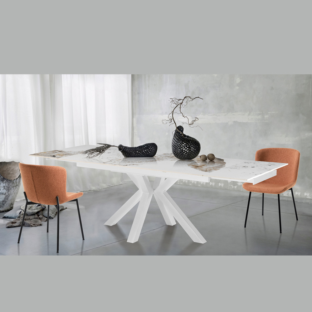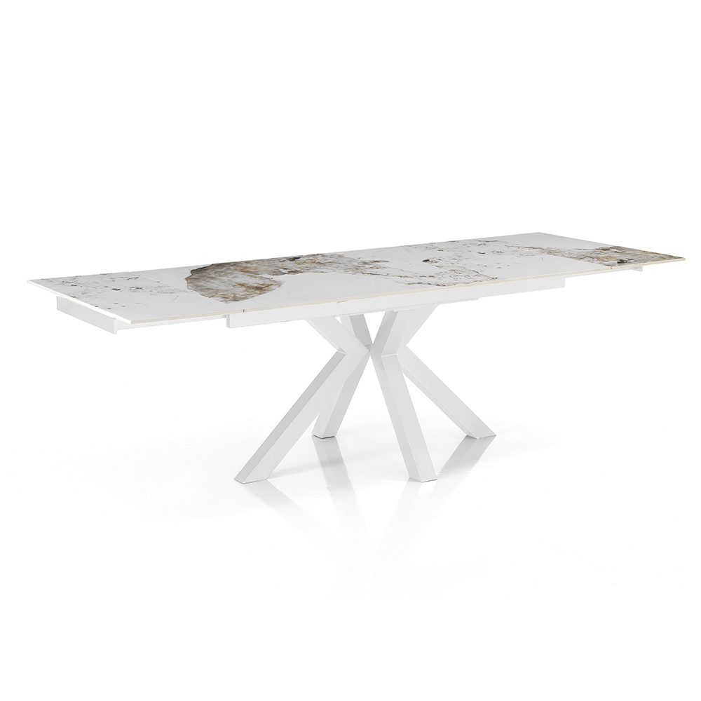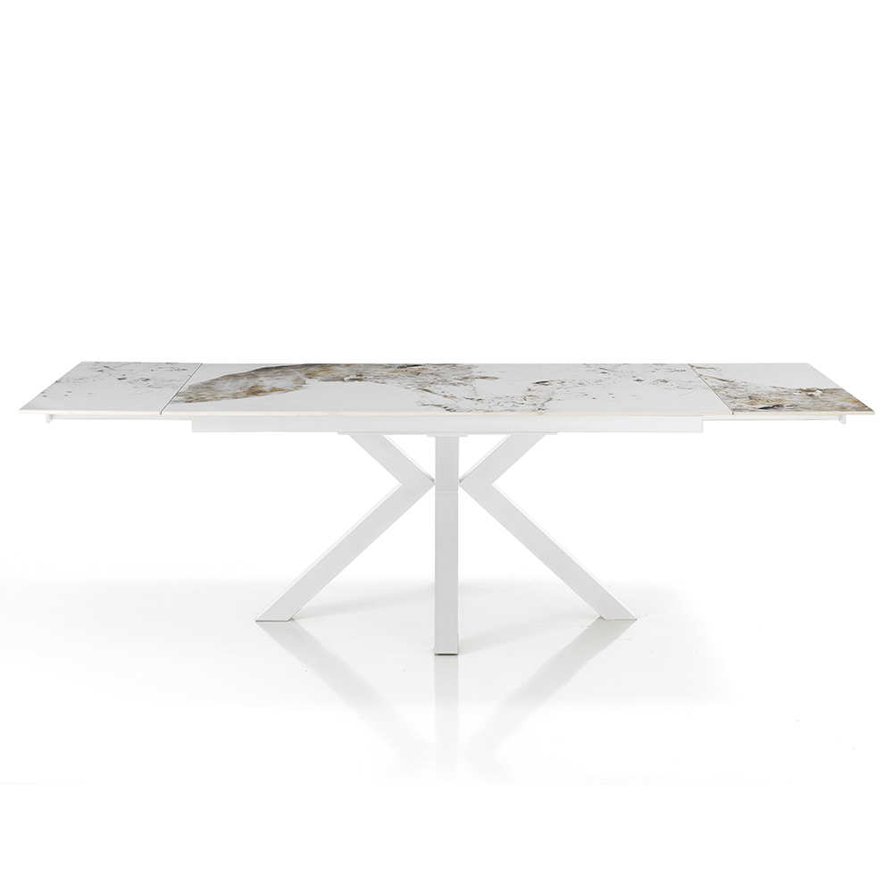 Dieser ausziehbare Tisch ist ein Meisterwerk zeitgenössischen Designs und vereint Eleganz und Funktionalität in einem einzigen Luxusmöbelstück. Die Tischplatte aus Keramik in Marmoroptik zeichnet sich durch eine komplizierte Maserung aus, die jedem Stück Einzigartigkeit und Persönlichkeit verleiht.