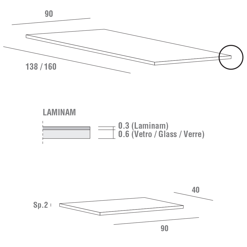 - L 160/200/240 x T 90 x H 76,5 cm.