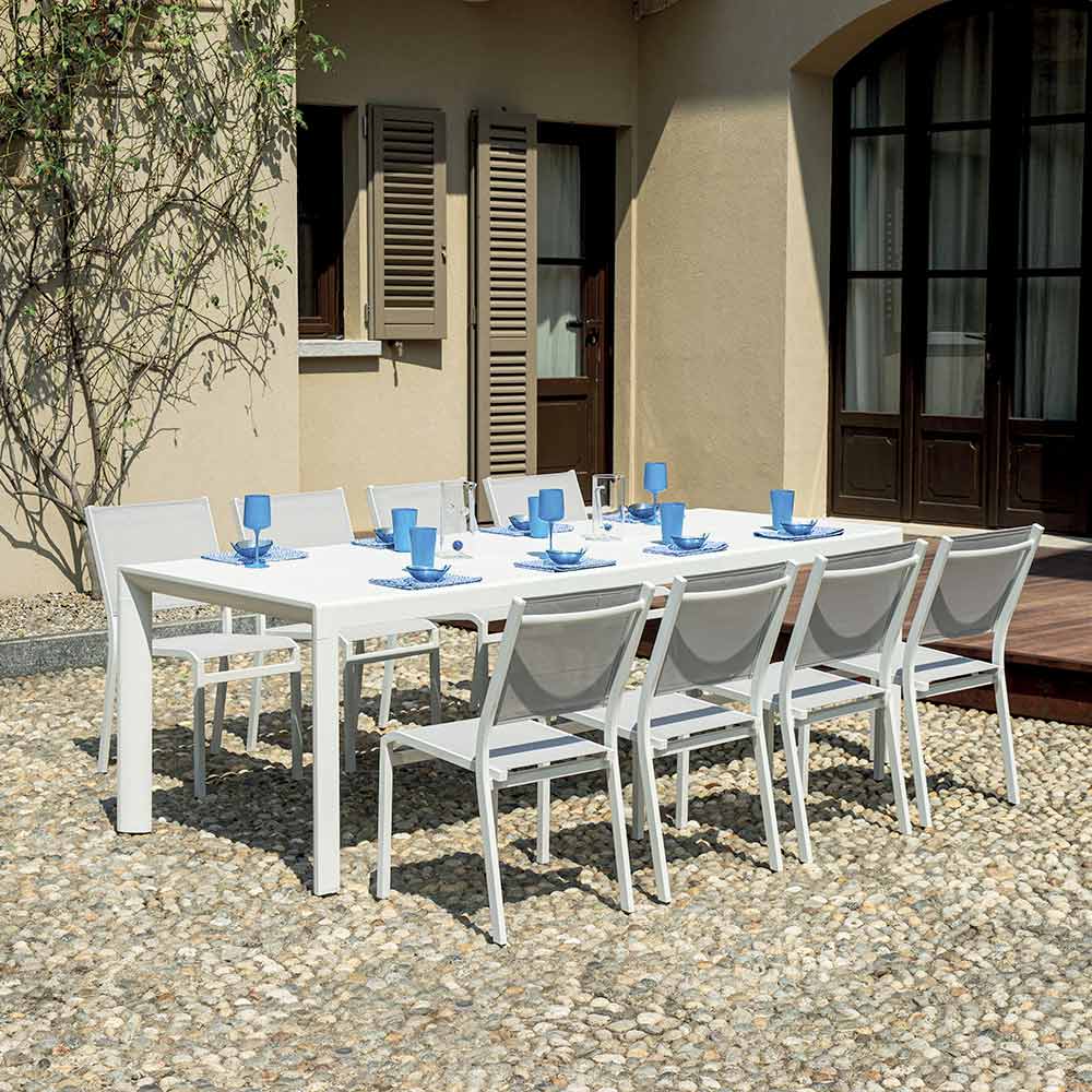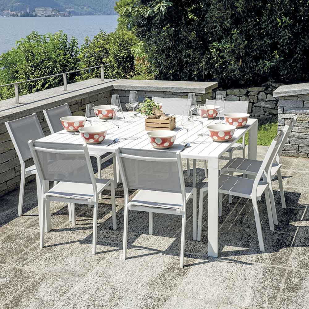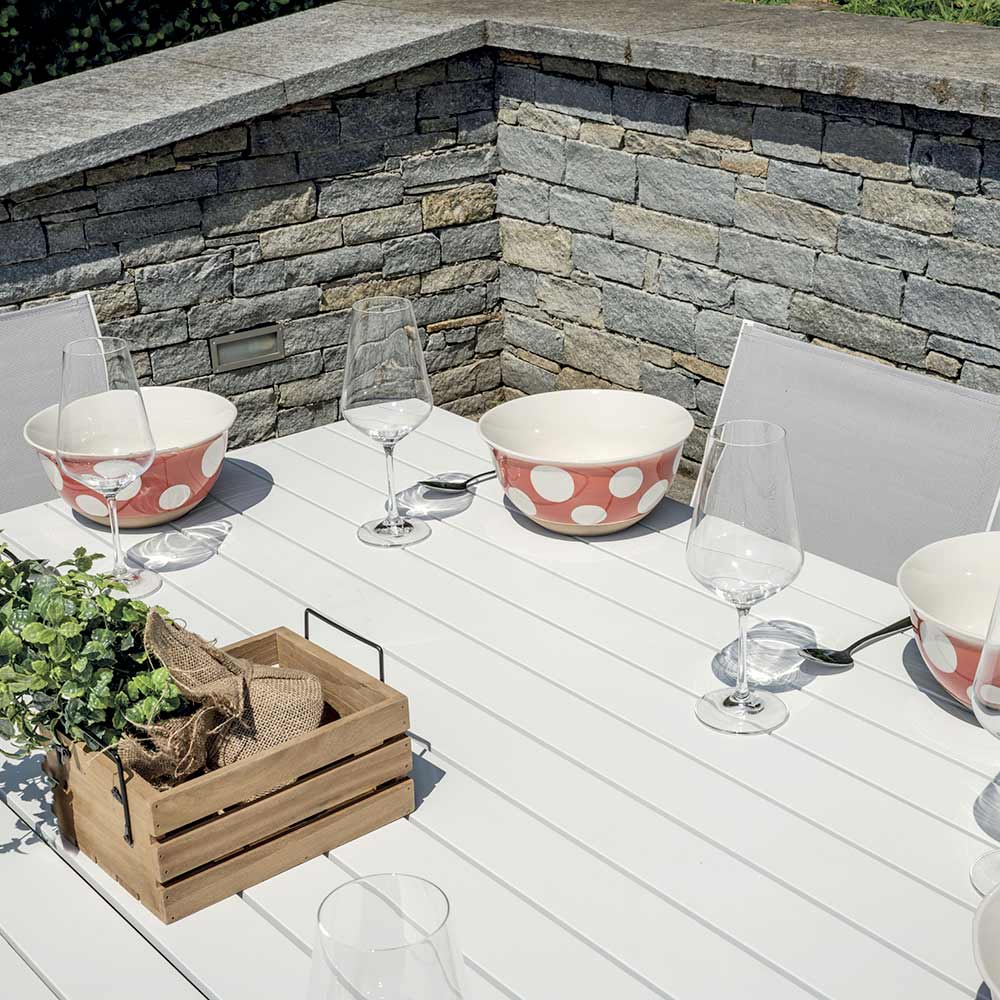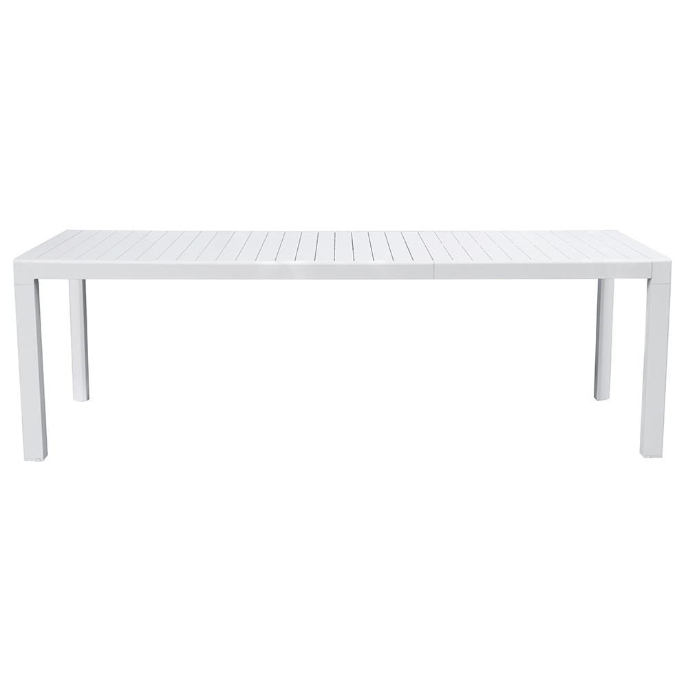Eleganz, Stärke und Zweckmäßigkeit treffen sich in diesem weißen Aluminiumtisch mit Lattenrost, ein Möbelstück, das Funktionalität und modernen Stil vereint. Die weiße Oberfläche und die klaren Linien machen ihn für jeden Außenbereich geeignet, vom Garten bis zur Terrasse, und verleihen ihm einen Hauch von zeitloser Raffinesse.