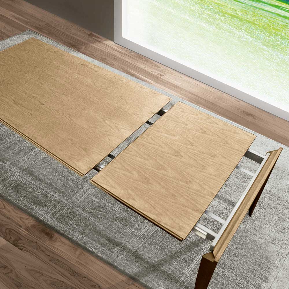 Dieser Ausziehtisch verkörpert essentielles Design und vereint Funktionalität mit zeitloser Eleganz . Gefertigt aus Holz , betont er die natürliche Schönheit der Maserung und macht jedes Stück zu einem Unikat. Die schlanken Linien und die klare geometrische Form fügen sich perfekt in moderne Räume ein, während die Ausziehfunktion einen mühelosen Wechsel vom Alltagsgebrauch bis hin zu größeren Runden ermöglicht, ohne dabei an Stil einzubüßen. Die sich verjüngende Tischplatte und die Beine verleihen optische Leichtigkeit und Stabilität und machen diesen Tisch zum Blickfang in Wohn- oder Esszimmer. Eine perfekte Balance aus italienischer Raffinesse , Vielseitigkeit und zeitlosem Design .
