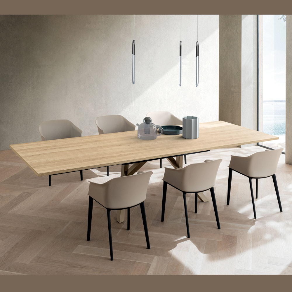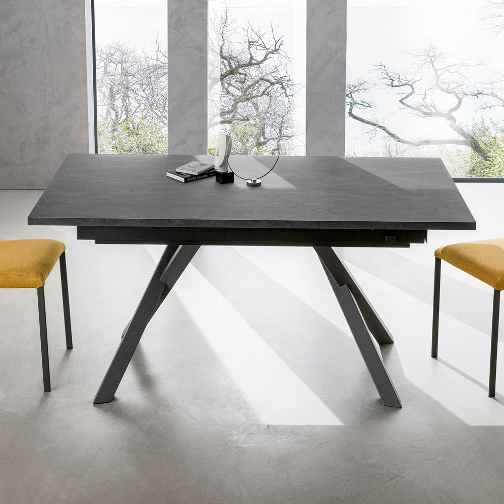 Indoor-Tisch mit HPL-Platte und X-förmigem Metallgestell, lackiert mit Epoxidpulver. Der Tisch ist mit einer Metallführung und seitlichem Synchronmechanismus im Buchstil ausziehbar.