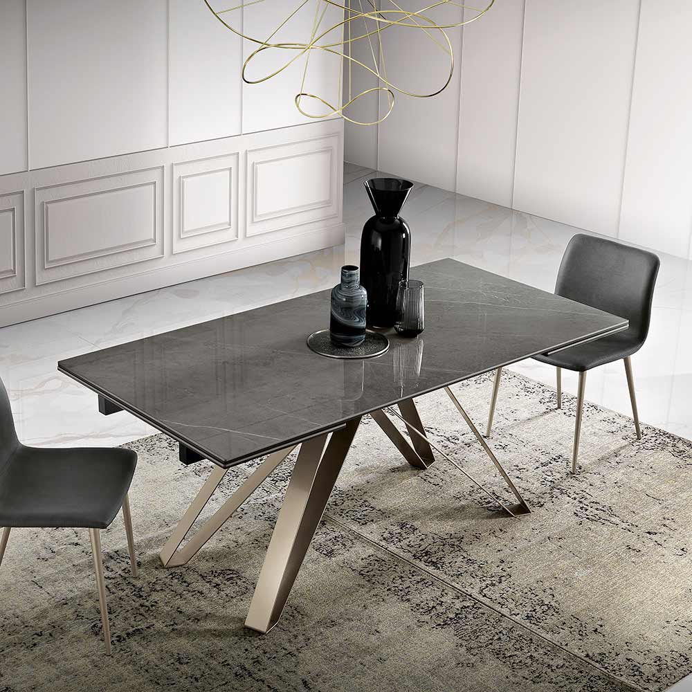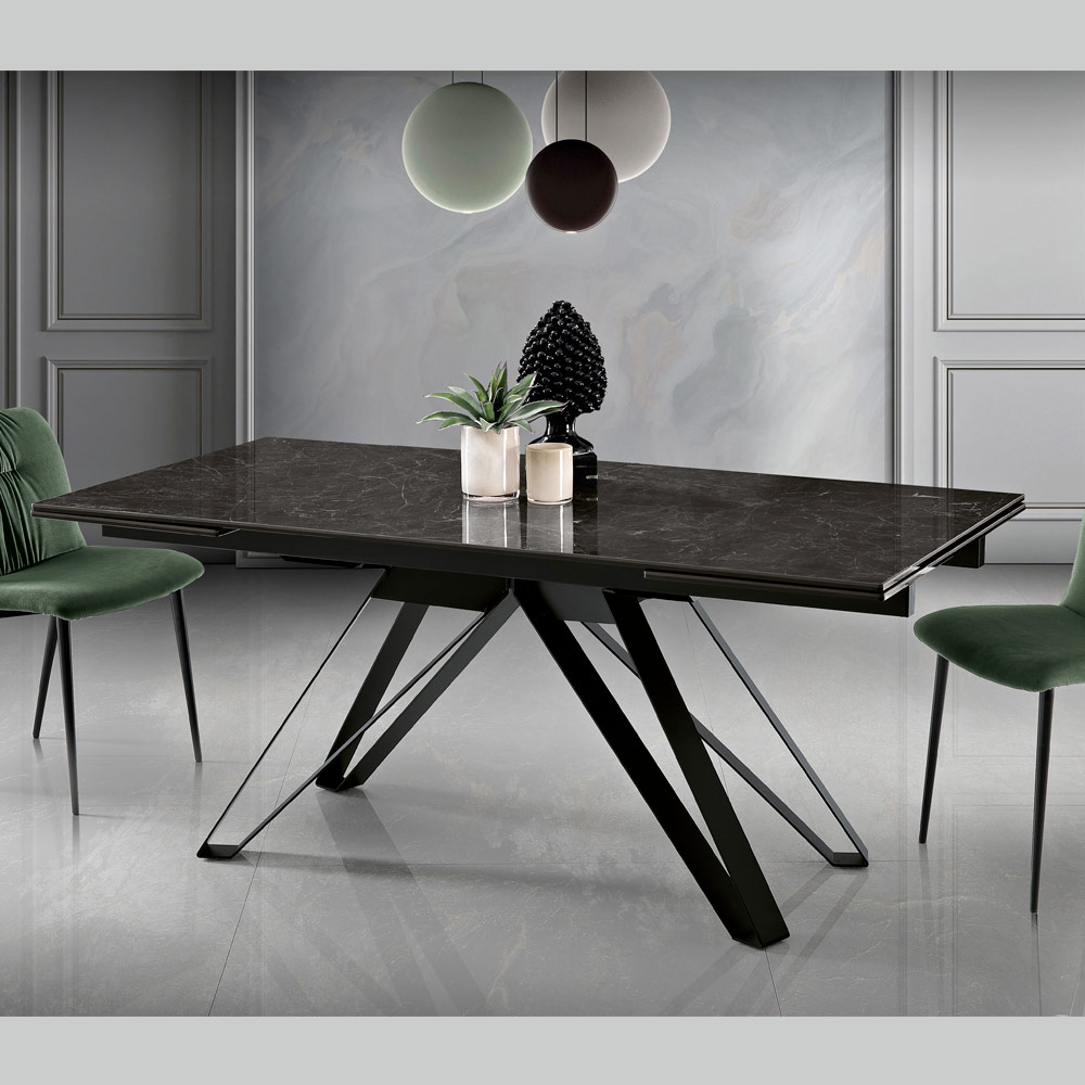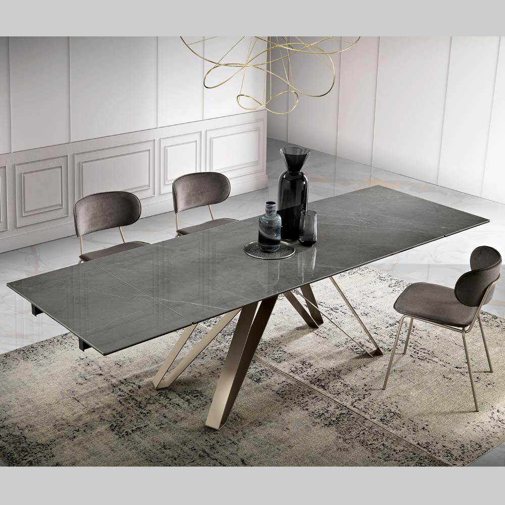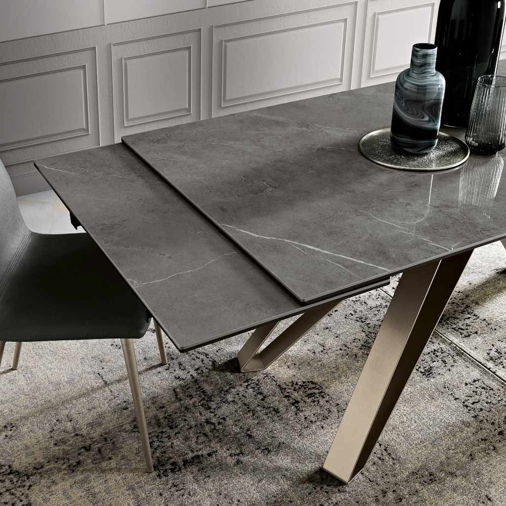 Eingebettet in eine raffinierte Farbpalette ist dieser ausziehbare Tisch ein Beispiel zeitgenössischer Eleganz. Die Glaskeramikplatte ist ein ästhetischer Triumph, eine natürliche Leinwand, auf der Adern gezeichnet sind, die der Oberfläche Tiefe und Bewegung verleihen.