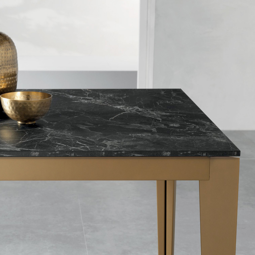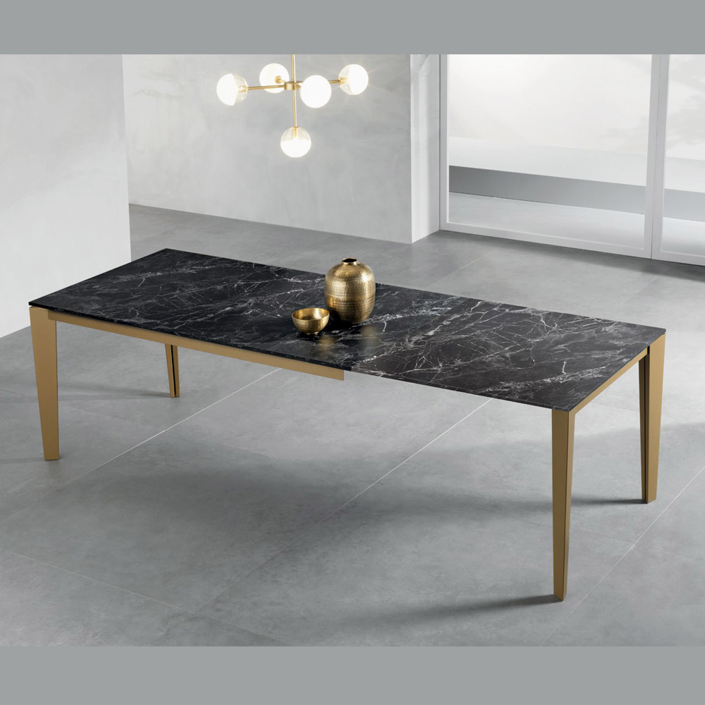 Dieser elegante und funktionale, ausziehbare Rechtecktisch vereint modernes Design mit praktischer Funktionalität. Die 18 mm dicke Tischplatte in dunkler Marmoroptik betont die warme, authentische Maserung des Marmors, während die Beine aus gealtertem, goldfarben lackiertem Metall für Stabilität und einen zeitgemäßen Akzent sorgen.