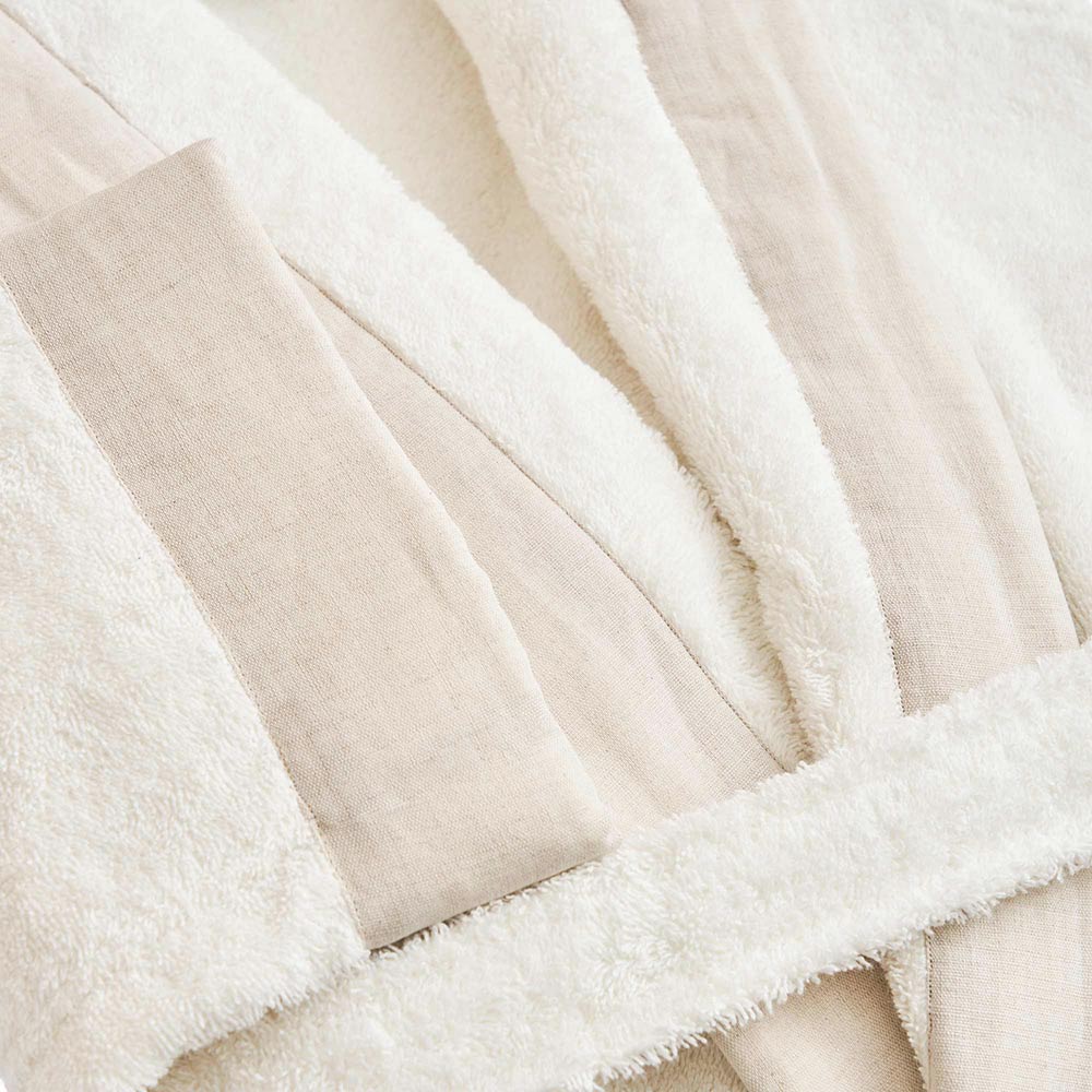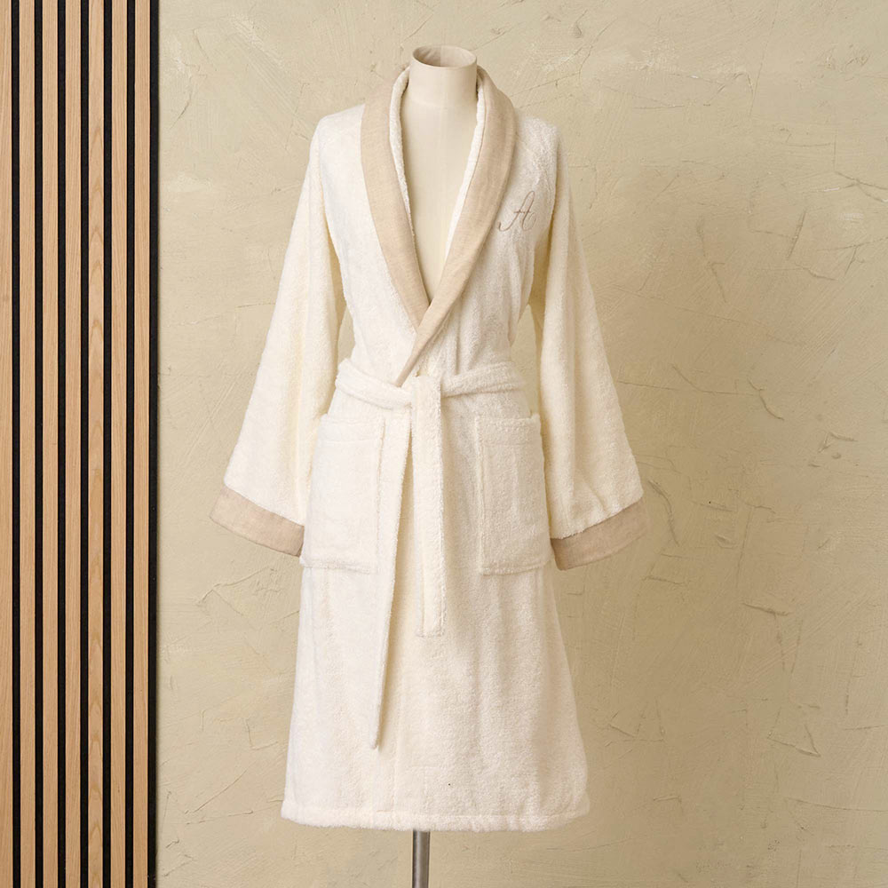 Bademantel aus Baumwollfrottee mit Schalkragen, Leinenrüsche und Monogramm – Weichheit