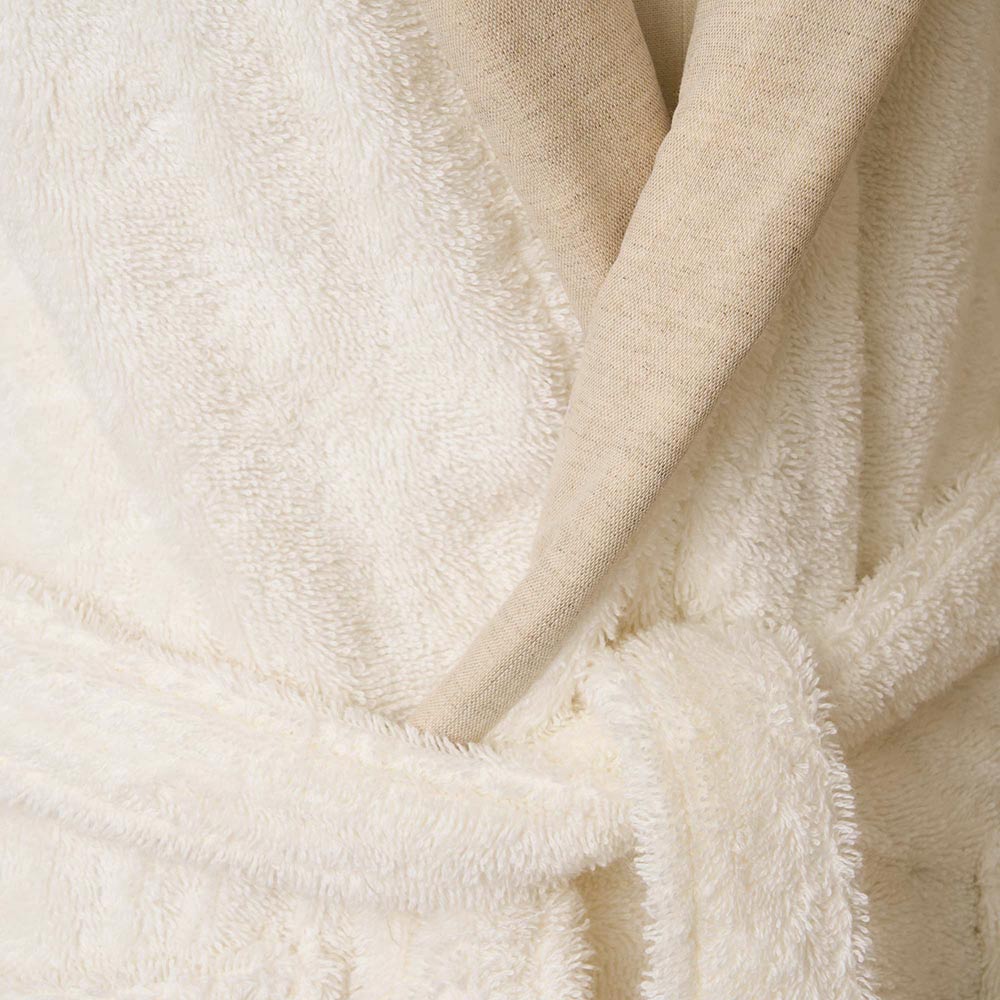 Bademantel mit Schalkragen aus 90 % reinem Baumwollfrottee, 430 g/m2, elfenbeinfarben, mit Volant aus reinem Leinen.