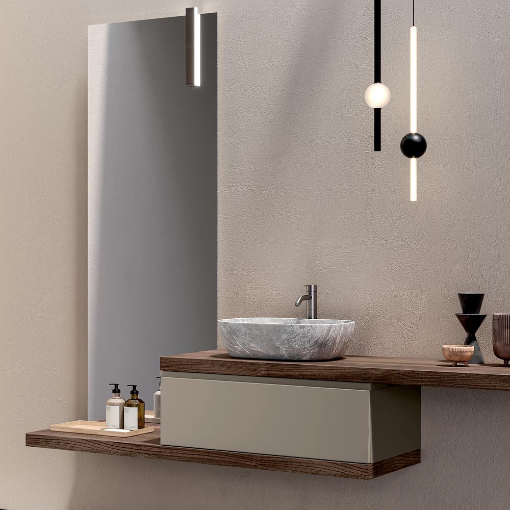 Eine Komplettlösung fürs Badezimmer, entwickelt für alle, die einen modernen, hängenden Badezimmerschrank wünschen, der sich durch warme Oberflächen, dezente Kontraste und eine starke ästhetische Identität auszeichnet.
