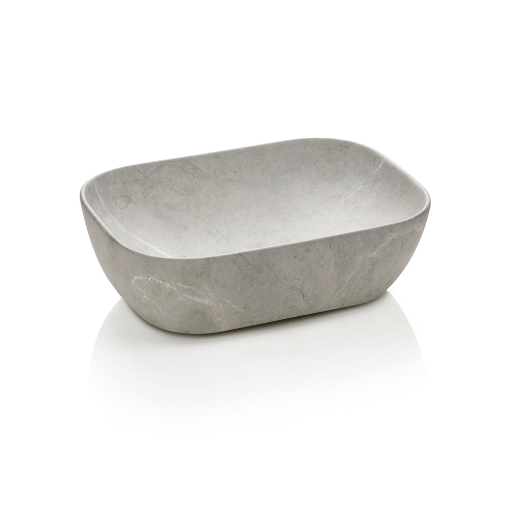 Das graue Steinkeramik-Waschbecken verleiht dem Ganzen eine raffinierte Note: kompakt, funktional und perfekt in die Komposition integriert, vereint es Widerstandsfähigkeit und Stil in einem einzigen Element.