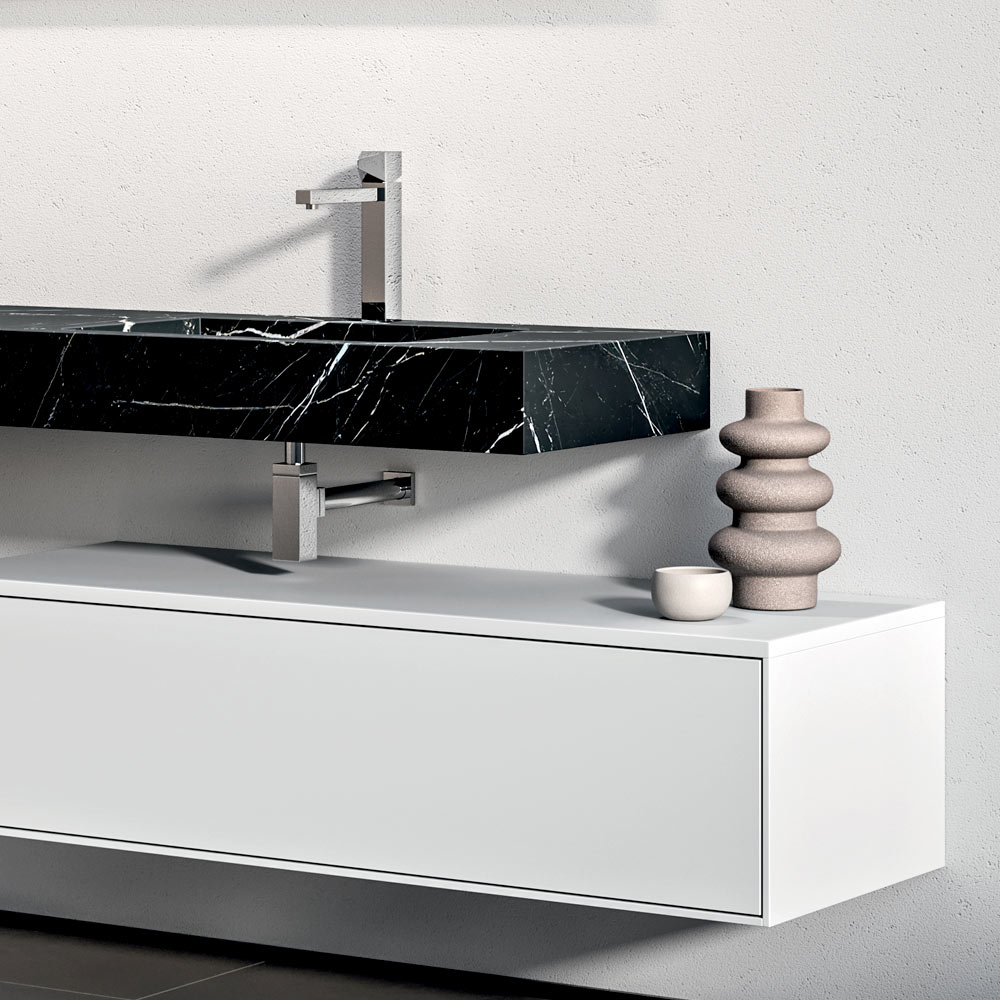 Das schwebende Design betont die Leichtigkeit der Formen und unterstreicht die Architektur des Raumes, während die geräumige Schublade für Funktionalität und Ordnung im Alltag sorgt. Die klaren Oberflächen und die reduzierten Linien definieren einen modernen, minimalistischen Stil mit starker Wirkung.