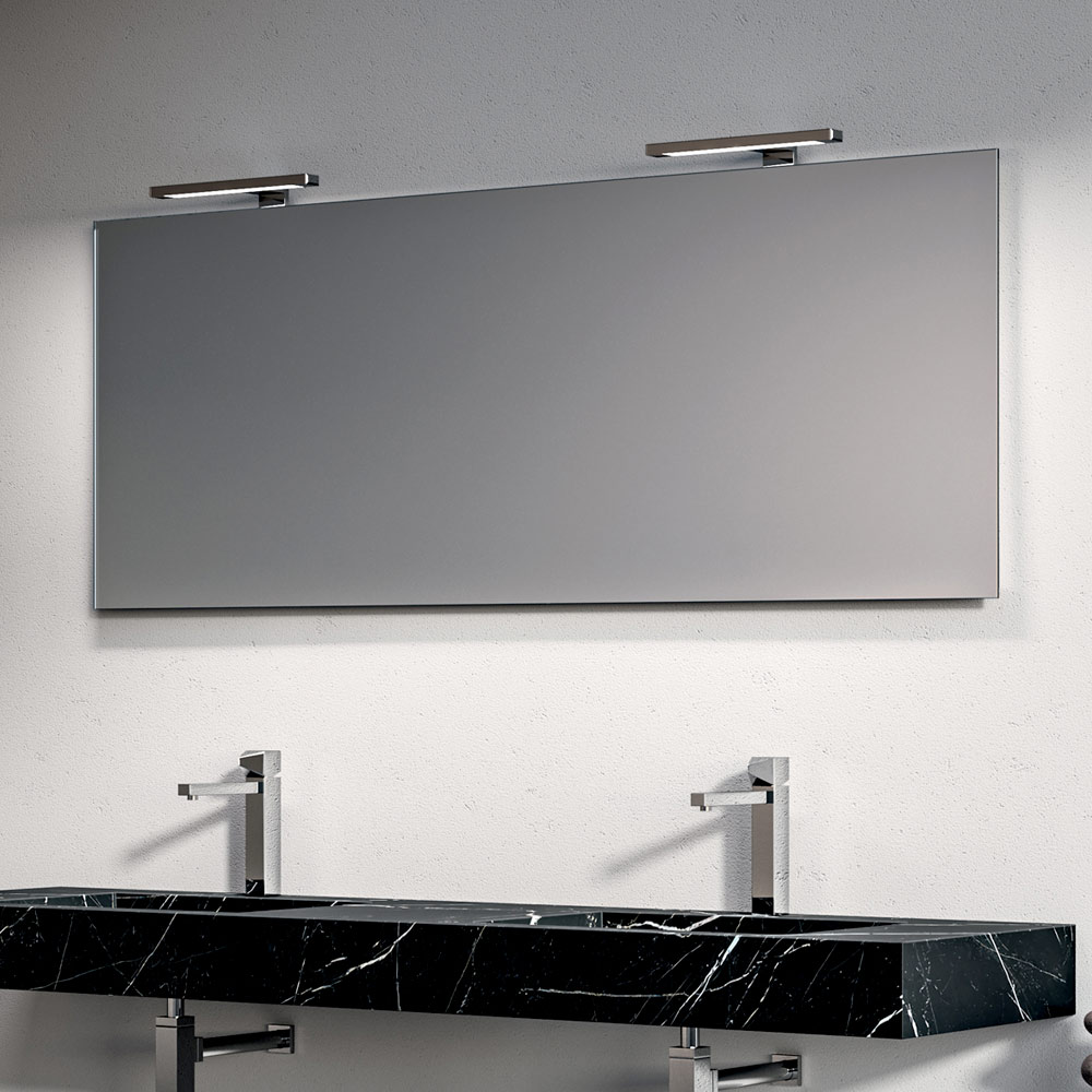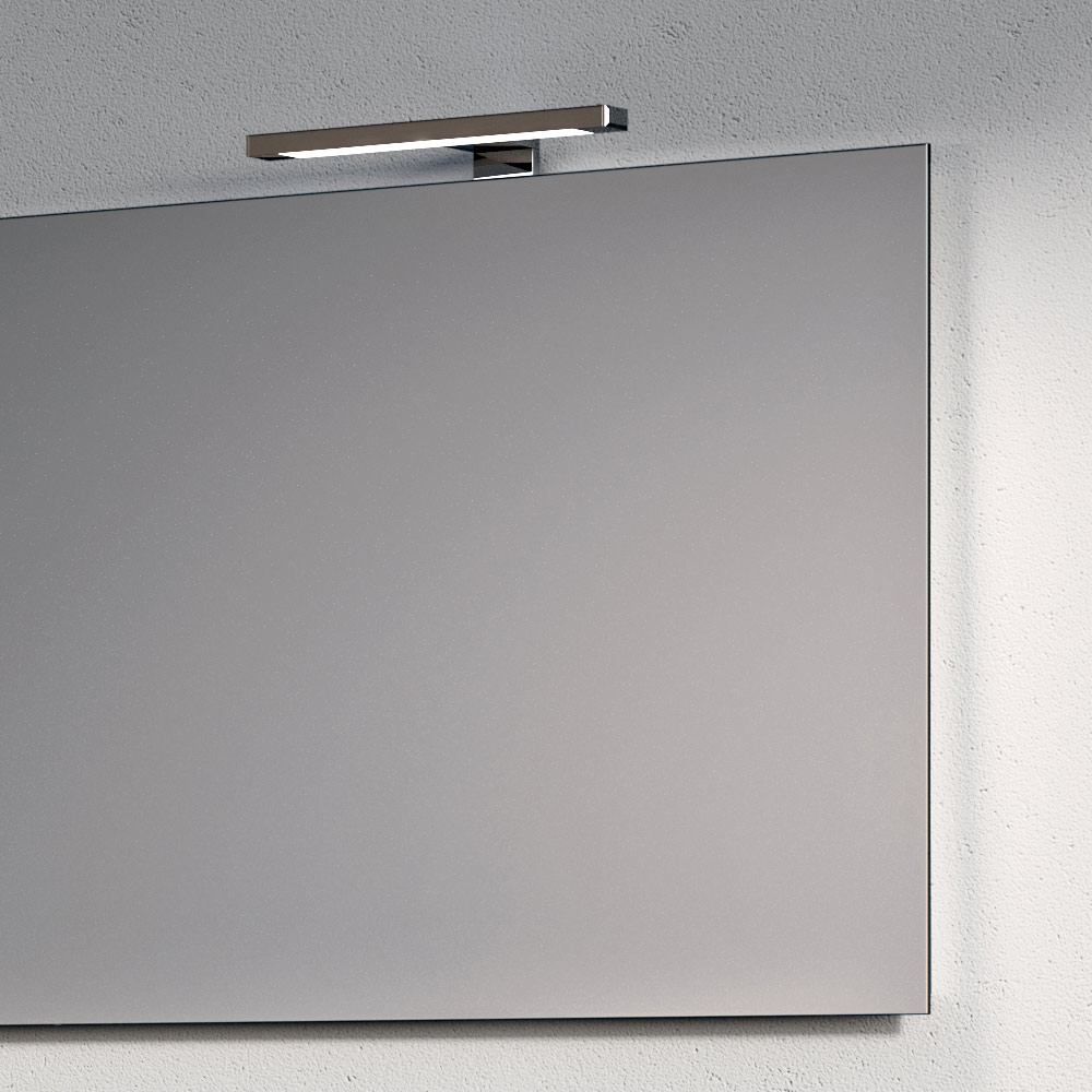 Der hinterleuchtete Spiegel vergrößert den Raum optisch und erzeugt ein gleichmäßiges, einhüllendes Licht, das durch elegante Chrom-LED-Lampen ergänzt wird, die dem Ganzen eine helle, moderne Note verleihen.