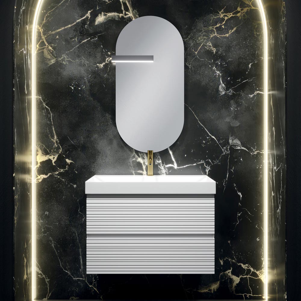Elegante , schwebende Badezimmerkomposition in zeitgenössischem Design, konzipiert für anspruchsvolle Umgebungen, in denen Ästhetik, Licht und Funktionalität harmonisch ineinanderfließen.