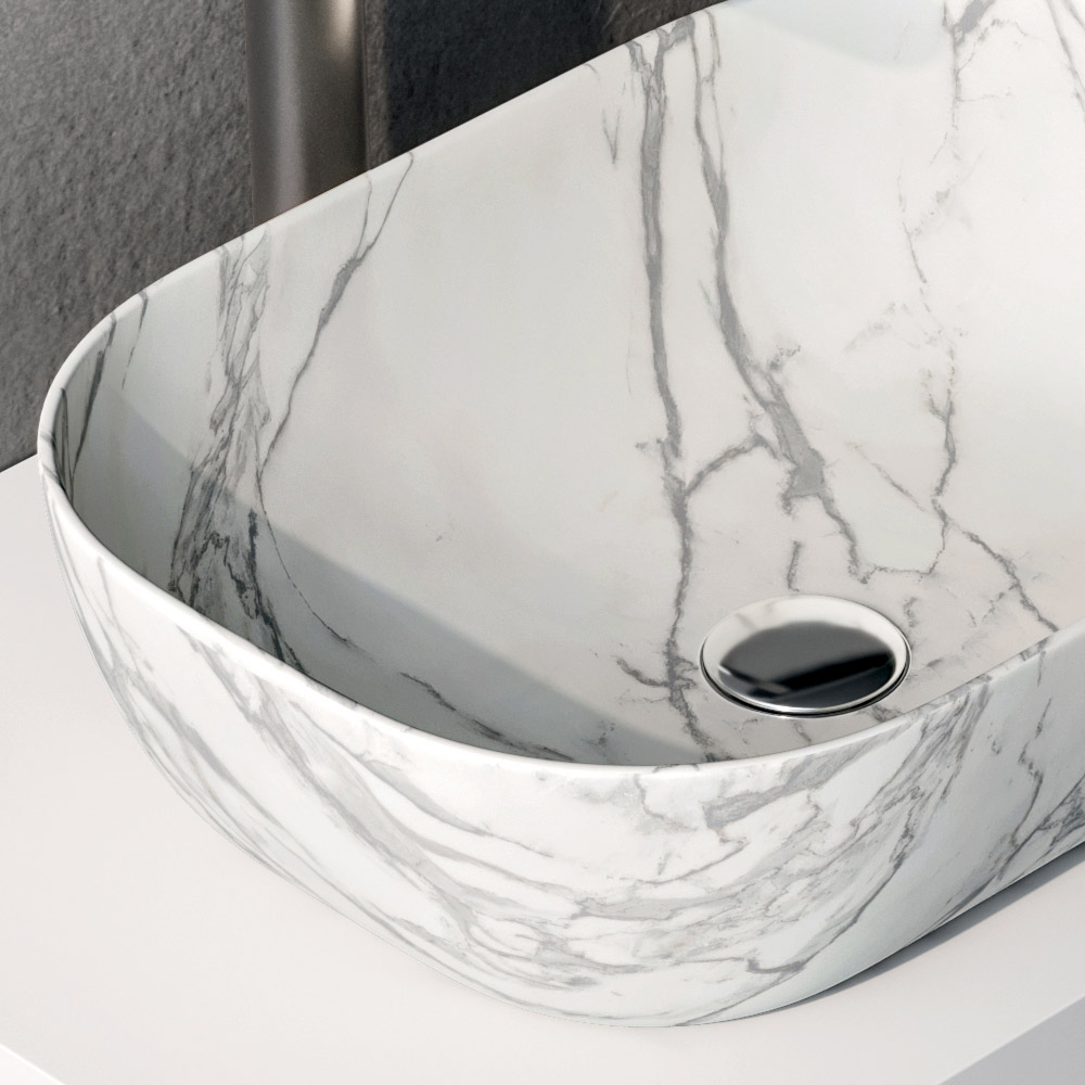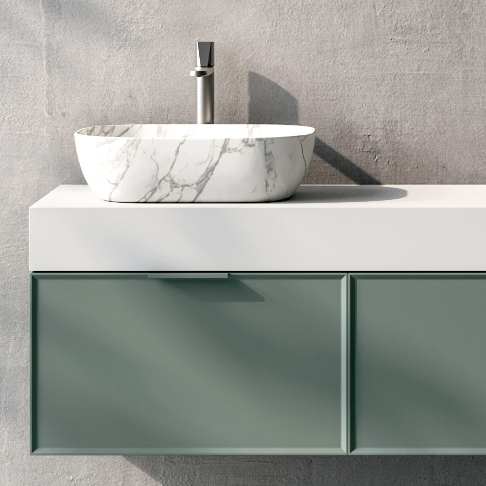 Die matte, weiße Waschtischplatte harmoniert perfekt mit dem Keramikwaschbecken in Calacatta-Optik , das sich durch eine leuchtende Oberfläche und eine feine, an Marmor erinnernde Maserung auszeichnet und so die gesamte Komposition aufwertet.